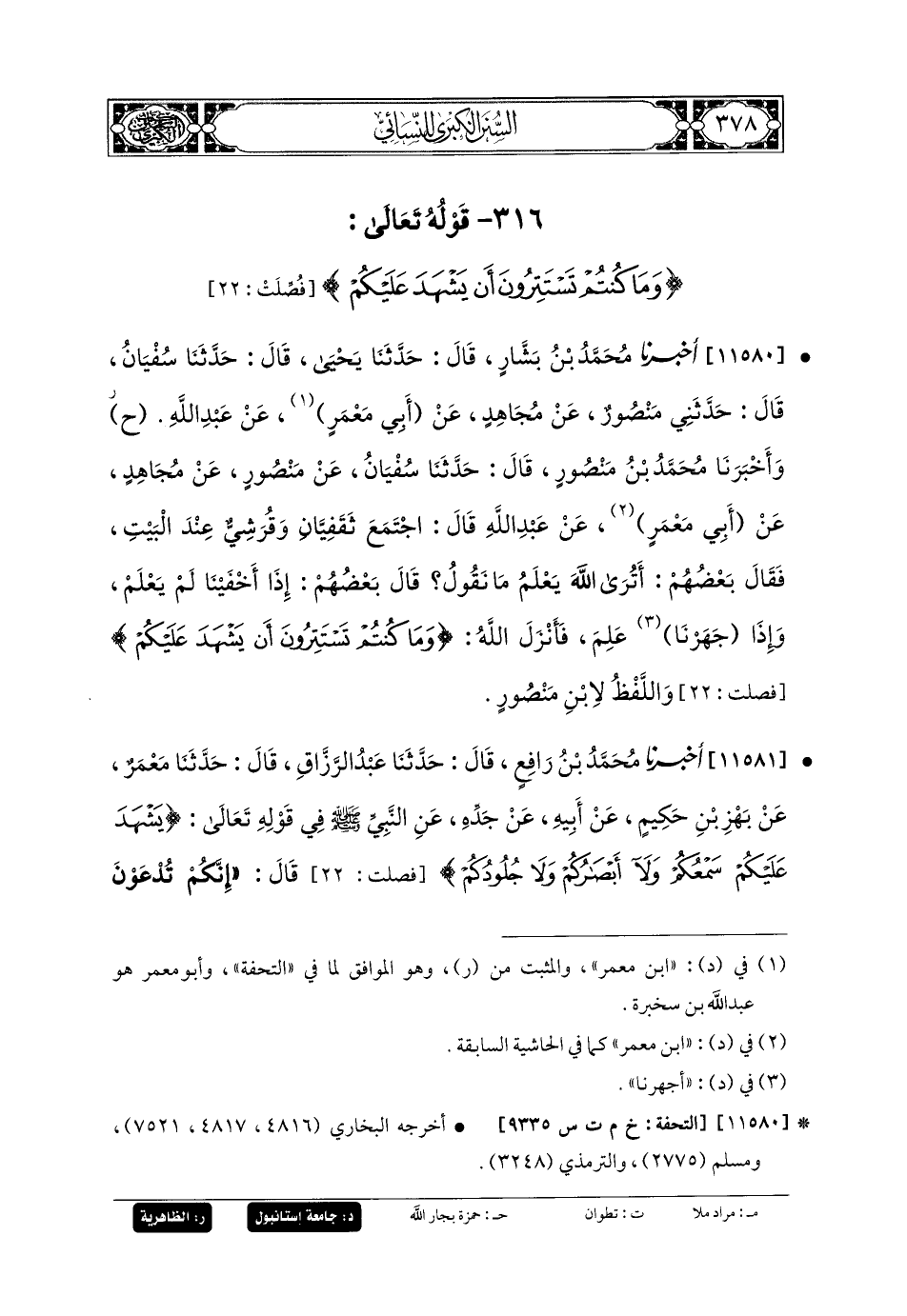 11580- أَخبَرنا مُحَمدُ بنُ بَشَّارٍ، قَالَ: حَدثنا يَحيَى، قَالَ: حَدثنا سُفيانُ، قَالَ: حَدَّثني مَنصُورٌ، عَن مُجَاهِدٍ، عَن أَبي مَعْمَرٍ، عَن عَبدِ اللهِ (ح) وَأَخبَرنا مُحَمدُ بنُ مَنصُورٍ، قَالَ: حَدثنا سُفيانُ، عَن مَنصُورٍ، عَن مُجَاهِدٍ، عَن أَبي مَعْمَرٍ، عَن عَبدِ اللهِ، قَالَ: اجْتَمَعَ ثَقَفِيَّانِ وَقُرَشِيٌّ عِنْدَ البَيْتِ، فَقَالَ بَعْضُهُمْ: أَتَرَى اللهَ يَعْلَمُ مَا نَقُولُ؟ قَالَ بَعْضُهُمْ: إِذَا أَخْفَيْنَا لَمْ يَعْلَمْ، وَإِذَا جَهَرْنَا عَلِمَ، فَأَنْزَلَ اللهُ: {وَمَا كُنْتُمْ تَسْتَتِرُونَ أَنْ يَشْهَدَ عَلَيْكُمْ}.