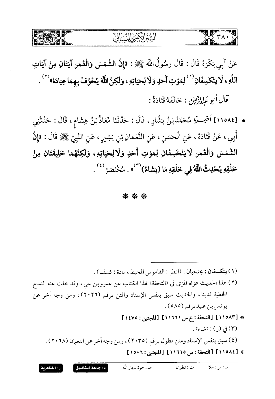 11584- أَخبَرنا مُحَمدُ بنُ بَشَّارٍ، قَالَ: حَدثنا مُعَاذُ بنُ هِشَامٍ، قَالَ: حَدَّثني أَبي، عَن قَتَادَةَ، عَنِ الحَسَنِ، عَنِ النُّعْمَانِ بنِ بَشِيرٍ، عَنِ النَّبيِّ صَلى الله عَليه وسَلم قَالَ: إِنَّ الشَّمْسَ وَالقَمَرَ لا يَنْخَسِفَانِ لِمَوْتِ أَحَدٍ وَلا لِحَيَاتِهِ، وَلَكِنَّهُمَا خَلِيقَتَانِ مِنْ خَلْقِهِ، يُحْدِثُ اللهُ فِي خَلْقِهِ مَا يَشَاءُ. مُخْتَصَرٌ.