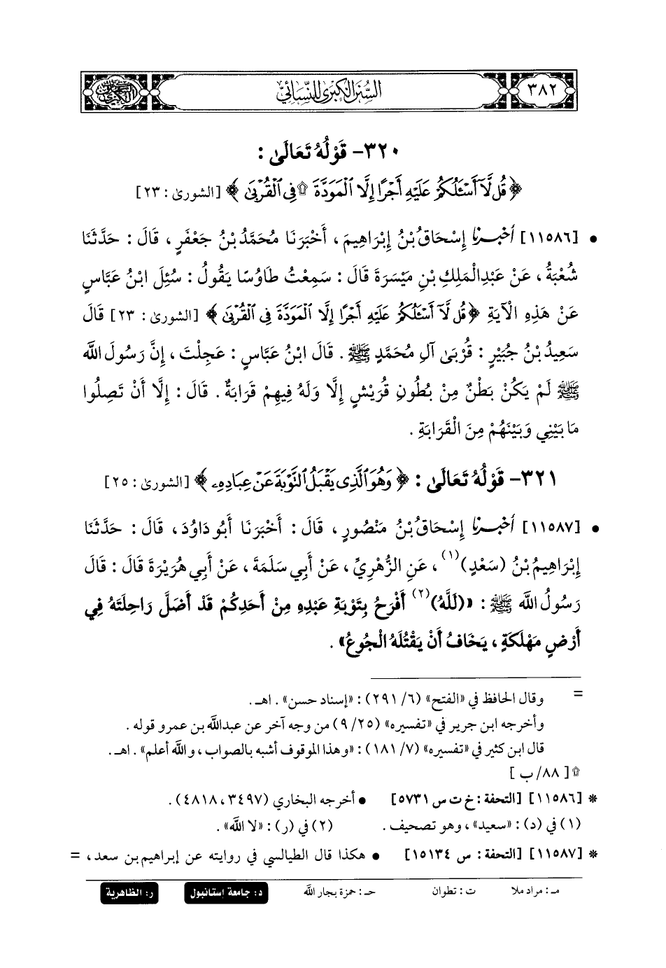 11586- أَخبَرنا إِسحَاقُ بنُ إِبرَاهِيمَ، قَالَ: أَخبَرنا مُحَمدُ بنُ جَعفَرٍ، قَالَ: حَدثنا شُعبَةُ، عَن عَبدِ المَلِكِ بنِ مَيْسَرَةَ، قَالَ: سَمِعْتُ طَاوُوسًا يَقُولُ: سُئِلَ ابنُ عَبَّاسٍ عَن هَذِهِ الآيَةِ: {قُلْ لا أَسْأَلُكُمْ عَلَيْهِ أَجْرًا إِلاَّ المَوَدَّةَ فِي القُرْبَى} قَالَ سَعِيدُ بنُ جُبَيرٍ: قُرْبَى آلِ مُحَمدٍ صَلى الله عَليه وسَلم، قَالَ ابنُ عَبَّاسٍ: عَجِلْتَ، إِنَّ رَسُولَ اللهِ صَلى الله عَليه وسَلم لَمْ يَكُنْ بَطْنٌ مِنْ بُطُونِ قُرَيْشٍ إِلاَّ وَلَهُ فِيهِمْ قَرَابَةٌ، قَالَ: إِلاَّ أَنْ تَصِلُوا مَا بَيْنِي وَبَيْنَهُمْ مِنَ القَرَابَةِ.