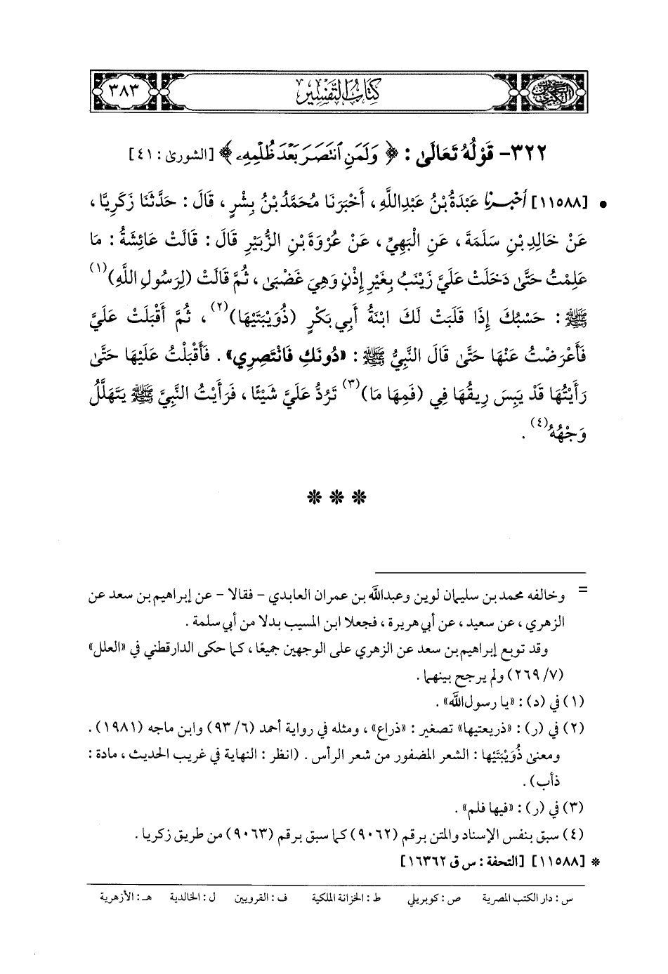 11588- أَخبَرنا عَبدَةُ بنُ عَبدِ اللهِ، أَخبَرنا مُحَمدُ بنُ بِشْرٍ، قَالَ: حَدثنا زَكَرِيَّا، عَن خَالِدِ بنِ سَلَمَةَ، عَنِ البَهِيِّ، عَن عُرْوَةَ بنِ الزُّبَيْرِ، قَالَ: قَالَتْ عَائِشَةُ: مَا عَلِمْتُ حَتَّى دَخَلَتْ عَلَيَّ زَيْنَبُ بِغَيْرِ إِذْنٍ وَهِيَ غَضْبَى، ثُمَّ قَالَتْ لِرَسُولِ اللهِ صَلى الله عَليه وسَلم: حَسْبُكَ إِذَا قَلَبَتْ لَكَ ابنَةُ أَبي بَكْرٍ زويبتَيْهَا، ثُمَّ أَقْبَلَتْ عَلَيَّ، فَأَعْرَضْتُ عَنهَا، حَتَّى قَالَ النَّبيُّ صَلى الله عَليه وسَلم: دُونَكِ فَانْتَصِرِي، فَأَقْبَلْتُ عَلَيْهَا، حَتَّى رَأَيْتُهَا قَدْ يَبِسَ رِيقُهَا فِي فمهَا، ما تَرُدُّ عَلَيَّ شَيْئًا، فَرَأَيْتُ النَّبيَّ صَلى الله عَليه وسَلم يَتَهَلَّلُ وَجْهُهُ.