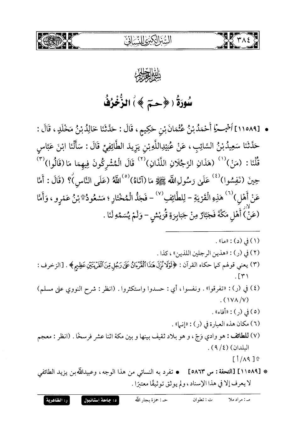 11589- أَخبَرنا أَحْمَدُ بنُ عُثْمَانَ بنِ حَكِيمٍ، قَالَ: حَدثنا خَالِدُ بنُ مَخْلَدٍ، قَالَ: حَدثنا سَعِيدُ بنُ السَّائِبِ، عَن عُبَيدِ اللهِ بنِ يَزِيدَ الطَّائِفِيِّ، قَالَ: سَأَلْنَا ابنَ عَبَّاسٍ قُلْنَا: مَن هَذَانِ الرَّجُلانِ اللَّذَانِ قَالَ المُشْرِكُونَ فِيهِمَا مَا قَالُوا حِينَ نَفِسوا عَلَى رَسُولِ اللهِ صَلى الله عَليه وسَلم، مَا آتَاهُ اللهُ عَلَى النَّاسِ؟ قَالَ: أَمَّا عَن أَهْلِ هَذِهِ القَرْيَةِ لِلْطَائِفِ فَجَدُّ المُخْتَارِ: مَسْعُودُ بنُ عَمْرٍو، وَأَمَّا عَن أَهْلِ مَكَّةَ: فَجَبَّارٌ مِنْ جَبَابِرَةِ قُرَيْشٍ، وَلَمْ يُسَمِّهِ لَنَا.