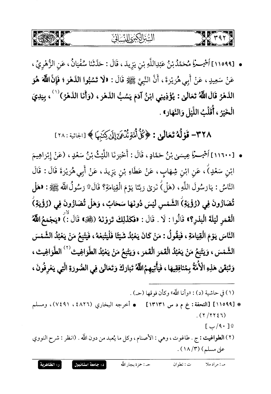 11599- أَخبَرنا مُحَمدُ بنُ عَبدِ اللهِ بنِ يَزِيدَ، قَالَ: حَدثنا سُفيانُ، عَنِ الزُّهْرِيِّ، عَن سَعِيدٍ، عَن أَبي هُرَيرَةَ، أَنَّ النَّبيَّ صَلى الله عَليه وسَلم قَالَ: لا تَسُبُّوا الدَّهْرَ، فَإِنَّ اللهَ هُوَ الدَّهْرُ، قَالَ اللهُ تعالى: يُؤْذِينِي ابنُ آدَمَ، يَسُبُّ الدَّهْرَ وَأَنَا الدَّهْرُ، بِيَدِي الخَيْرُ، أُقَلِّبُ اللَّيْلَ وَالنَّهَارَ.