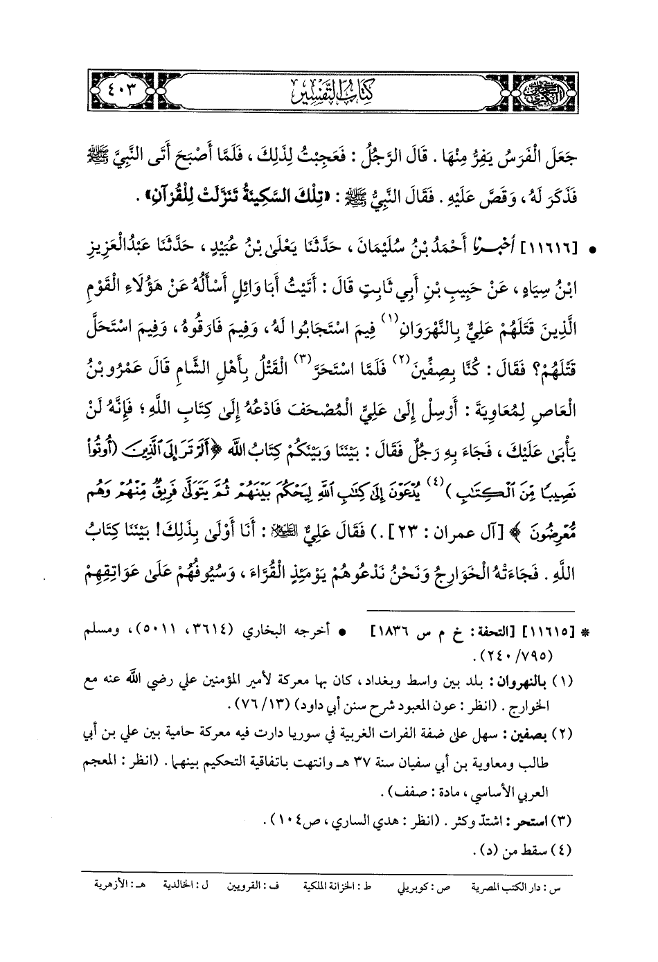 11616 - أَخبَرنا أَحْمَدُ بنُ سُلَيمَانَ، حَدثنا يَعْلَى بنُ عُبَيدٍ، حَدثنا عَبدُ العَزِيزِ بنُ سِيَاهٍ، عَن حَبِيبِ بنِ أَبي ثَابِتٍ، قَالَ: أَتَيْتُ أَبَا وَائِلٍ أَسْأَلُهُ عَن هَؤُلاءِ القَوْمِ الَّذِينَ قَتَلَهُمْ عَليٌّ بِالنَّهْرَوَانِ، فِيمَ اسْتَجَابُوا لَهُ، وَفِيمَ فَارَقُوهُ، وَفِيمَ اسْتَحَلَّ قَتْلَهُمْ، فَقَالَ: كُنَّا بِصِفِّينَ، فَلَمَّا اسْتَحَرَّ القَتْلُ بِأَهْلِ الشَّامِ، قَالَ عَمرُو بنُ العَاصِ لِمُعاويَةَ: أَرْسِلْ إِلَى عَليٍّ المُصْحَفَ، فَادْعُهُ إِلَى كِتَابِ اللهِ، فَإِنَّهُ لَنْ يَأْبَى عَلَيْكَ، فَجَاءَ بِهِ رَجُلٌ، فَقَالَ: بَيْنَنَا وَبَيْنَكُمْ كِتَابُ اللهِ: {أَلَمْ تَرَ إِلَى الَّذِينَ (أُوتُوا نَصِيبًا مِنَ الكِتَابِ) (1) يُدْعَوْنَ إِلَى كِتَابِ اللهِ لِيَحْكُمَ بَيْنَهُمْ ثُمَّ يَتَوَلَّى فَرِيقٌ مِنْهُمْ وَهُمْ مُعْرِضُونَ}، فَقَالَ عَليٌّ عَلَيْهِ السَّلامُ: أَنَا أَوْلَى بِذَلِكَ، بَيْنَنَا كِتَابُ اللهِ، فَجَاءَتْهُ الخَوَارِجُ، وَنَحْنُ نَدْعُوهُمْ يَوْمَئِذٍ القُرَّاءَ، وَسُيُوفُهُمْ عَلَى عَوَاتِقِهِمْ، فَقَالُوا: يَا أَمِيرَ المُؤْمِنِينَ، مَا نَنْتَظِرُ بِهَؤُلاءِ القَوْمِ الَّذِينَ عَلَى التَّلِّ، أَلا نَمْشِي إِلَيْهِمْ بِسُيُوفِنَا حَتَّى يَحْكُمَ اللهُ بَيْنَنَا وَبَيْنَهُمْ؟ فَتَكَلَّمَ سَهْلُ بنُ حُنَيْفٍ،