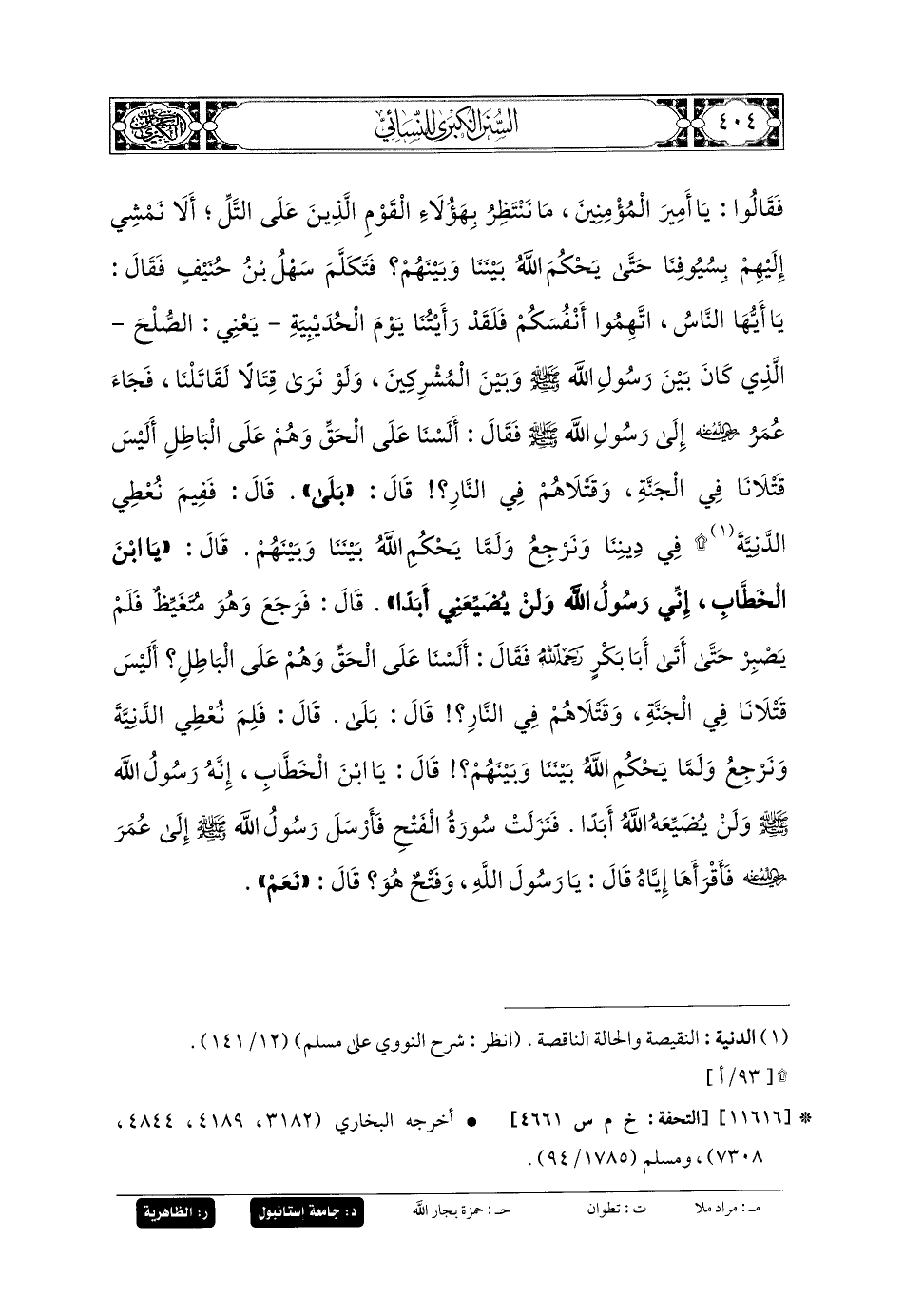فَقَالَ: يَا أَيُّهَا النَّاسُ، اتَّهِمُوا أَنْفُسَكُمْ، فَلَقَدْ رَأَيْتُنَا يَوْمَ الحُدَيْبِيَةِ، يَعْنِي الصُّلْحَ الَّذِي كَانَ بَيْنَ رَسُولِ اللهِ صَلى الله عَليه وسَلم وَبَيْنَ المُشْرِكِينَ، وَلَوْ نَرَى قِتَالاً لَقَاتَلْنَا، فَجَاءَ عُمَرُ رَضِيَ اللهُ عَنهُ إِلَى رَسُولِ اللهِ صَلى الله عَليه وسَلم فَقَالَ: أَلَسْنَا عَلَى الحَقِّ وَهُمْ عَلَى البَاطِلِ؟ أَلَيْسَ قَتْلانَا فِي الجَنَّةِ وَقَتْلاهُمْ فِي النَّارِ؟ قَالَ: بَلَى، قَالَ: فَفِيمَ نُعْطِي الدَّنِيَّةَ فِي دِينِنَا، وَنَرْجِعُ وَلَمَّا يَحْكُمِ اللهُ بَيْنَنَا وَبَيْنَهُمْ؟ قَالَ: يَا ابنَ الخَطَّابِ، إِنِّي رَسُولُ اللهِ، وَلَنْ يُضَيِّعَنِي أَبَدًا، قَالَ: فَرَجَعَ وَهُوَ مُتَغَيِّظٌ، فَلَمْ يَصْبِرْ حَتَّى أَتَى أَبَا بَكْرٍ رَحِمَهُ اللهُ، فَقَالَ: أَلَسْنَا عَلَى الحَقِّ وَهُمْ عَلَى البَاطِلِ؟ أَلَيْسَ قَتْلانَا فِي الجَنَّةِ وَقَتْلاهُمْ فِي النَّارِ؟ قَالَ: بَلَى، قَالَ: فَلِمَ نُعْطِي الدَّنِيَّةَ وَنَرْجِعُ، وَلَمَّا يَحْكُمِ اللهُ بَيْنَنَا وَبَيْنَهُمْ؟ قَالَ: يَا ابنَ الخَطَّابِ، إِنَّهُ رَسُولُ اللهِ صَلى الله عَليه وسَلم، وَلَنْ يُضَيِّعَهُ اللهُ أَبَدًا، فَنَزَلَتْ سُورَةُ الفَتْحِ، فَأَرْسَلَ رَسُولُ اللهِ صَلى الله عَليه وسَلم إِلَى عُمَرَ رَضِيَ اللهُ عَنهُ، فَأَقْرَأَهَا إِيَّاهُ، قَالَ: يَا رَسُولَ اللهِ، وَفَتْحٌ هُوَ؟ قَالَ: نَعَمْ.