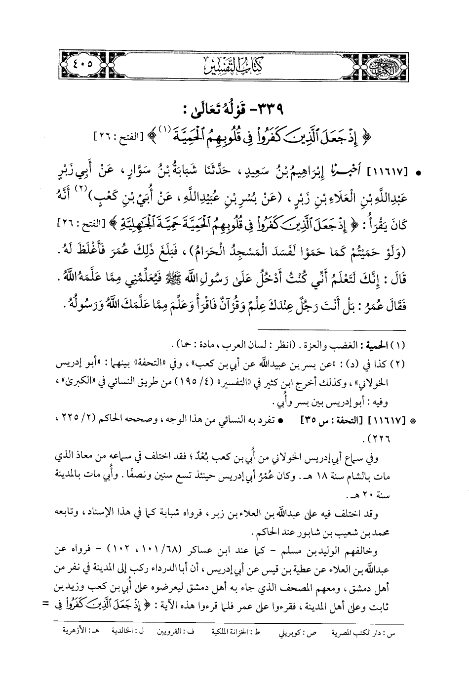 11617- أَخبَرنا إِبرَاهِيمُ بنُ سَعِيدٍ، حَدثنا شَبَابَةُ بنُ سَوَّارٍ، عَن أَبي زَبْرٍ عَبدِ اللهِ بنِ العَلاءِ بنِ زَبْرٍ، عَن بُسْرِ بنِ عُبَيدِ اللهِ، عَن أَبي إِدرِيسَ (1)، عَن أُبَيِّ بنِ كَعْبٍ، أَنَّهُ كَانَ يَقْرَأُ: {إِذْ جَعَلَ الَّذِينَ كَفَرُوا فِي قُلُوبِهِمُ الحَمِيَّةَ حَمِيَّةَ الجَاهِلِيَّةِ}، وَلَوْ حَمِيتُمْ كَمَا حَمَوْا لَفَسَدَ المَسْجِدُ الحَرَامُ، فَبَلَغَ ذَلِكَ عُمَرَ، فَأَغْلَظَ لَهُ، قَالَ: إِنَّكَ لَتَعْلَمُ أَنِّي كُنْتُ أَدْخُلُ عَلَى رَسُولِ اللهِ صَلى الله عَليه وسَلم، فَيُعَلُّمُنِي مِمَّا عَلَّمَهُ اللهُ، فَقَالَ عُمَرُ: بَلْ أَنْتَ رَجُلٌ عِنْدَكَ عِلْمٌ وَقُرْآنٌ، فَاقْرَأْ وَعَلِّمْ مِمَّا عَلَّمَكَ اللهُ وَرَسُولُهُ.