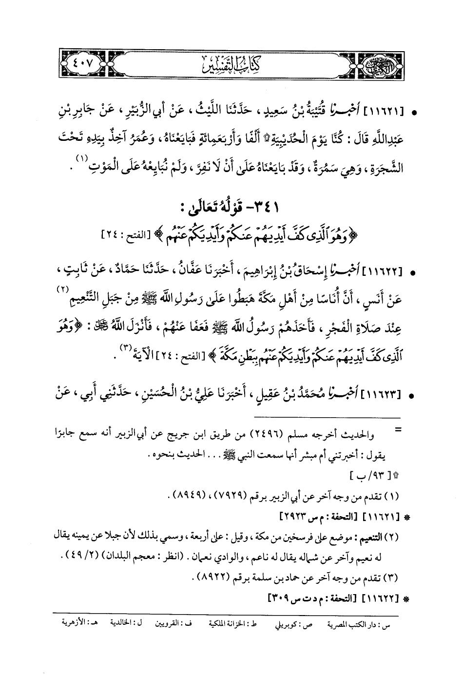 11622- أَخبَرنا إِسحَاقُ بنُ إِبرَاهِيمَ، أَخبَرنا عَفَّانُ، حَدثنا حَمَّادٌ، عَن ثَابِتٍ، عَن أَنَسٍ، أَنَّ أنَاسًا مِنْ أَهْلِ مَكَّةَ هَبَطُوا عَلَى رَسُولِ اللهِ صَلى الله عَليه وسَلم مِنْ جَبَلِ التَّنْعِيمِ عِنْدَ صَلاةِ الفَجْرِ، فَأَخَذَهُمْ رَسُولُ اللهِ صَلى الله عَليه وسَلم فَعَفَا عَنهُمْ، فَأَنْزَلَ اللهُ عَزَّ وَجَلَّ: {وَهُوَ الَّذِي كَفَّ أَيْدِيَهُمْ عَنكُمْ وَأَيْدِيَكُمْ عَنهُمْ ببطن مكة} الآيَةَ.