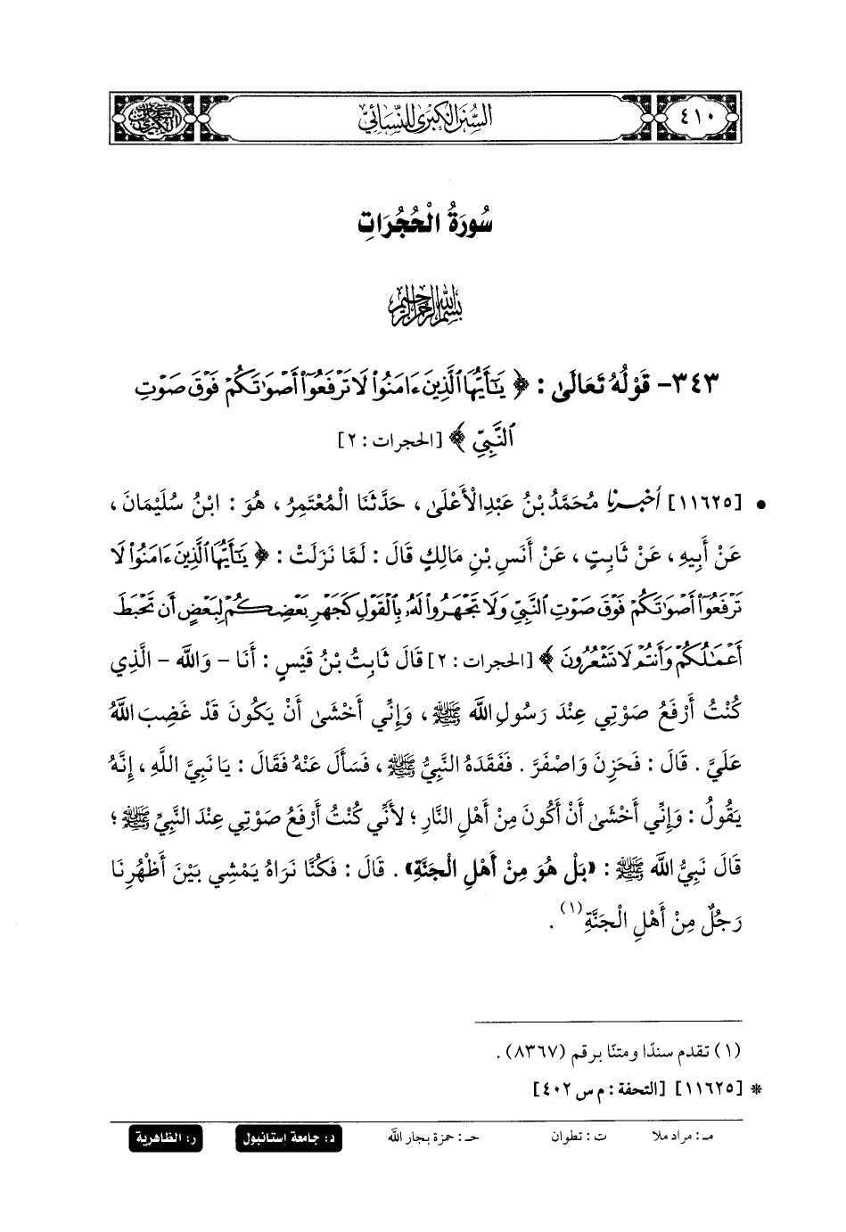 11625- أَخبَرنا مُحَمدُ بنُ عَبدِ الأَعْلَى، حَدثنا المُعْتَمِرُ، هُوَ ابنُ سُلَيمَانَ، عَن أَبيهِ، عَن ثَابِتٍ، عَن أَنَسِ بنِ مَالِكٍ، قَالَ: لَمَّا نَزَلَتْ: {يَا أَيُّهَا الَّذِينَ آمَنُوا لا تَرْفَعُوا أَصْوَاتَكُمْ فَوْقَ صَوْتِ النَّبيِّ وَلا تَجْهَرُوا لَهُ بِالقَوْلِ كَجَهْرِ بَعْضِكُمْ لِبَعْضٍ أَنْ تَحْبَطَ أَعْمَالُكُمْ وَأَنْتُمْ لا تَشْعُرُونَ}، قَالَ ثَابِتُ بنُ قَيسٍ: أَنَا وَاللهِ الَّذِي كُنْتُ أَرْفَعُ صَوْتِي عِنْدَ رَسُولِ اللهِ صَلى الله عَليه وسَلم، وَإِنِّي أَخْشَى أَنْ يَكُونَ قَدْ غَضِبَ اللهُ عَلَيَّ، قَالَ: فَحَزِنَ وَاصْفَرَّ، فَفَقَدَهُ النَّبيُّ صَلى الله عَليه وسَلم، فَسَأَلَ عَنهُ، فَقَالَ: يَا نَبِيَّ اللهِ، إِنَّهُ يَقُولُ: وَإِنِّي أَخْشَى أَنْ أَكُونَ مِنْ أَهْلِ النَّارِ، لأَنِّي كُنْتُ أَرْفَعُ صَوْتِي عِنْدَ النَّبيِّ صَلى الله عَليه وسَلم، قَالَ نَبِيُّ اللهِ صَلى الله عَليه وسَلم: بَلْ هُوَ مِنْ أَهْلِ الجَنَّةِ، قَالَ: فَكُنَّا نَرَاهُ يَمْشِي بَيْنَ أَظْهُرِنَا رَجُلٌ مِنْ أَهْلِ الجَنَّةِ.