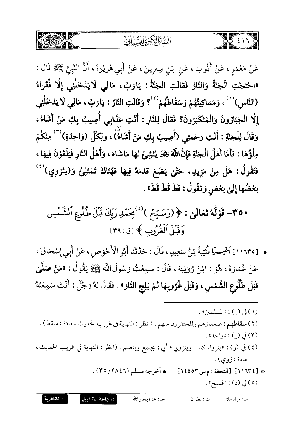 11635- أَخبَرنا قُتَيبَةُ بنُ سَعِيدٍ، قَالَ: حَدثنا أَبو الأَحْوَصِ، عَن أَبي إِسحَاقَ، عَن عُمَارَةَ، هُوَ ابنُ رُويْبَةَ، قَالَ: سَمِعْتُ رَسُولَ اللهِ صَلى الله عَليه وسَلم يَقُولُ: مَنْ صَلَّى قَبْلَ طُلُوعِ الشَّمْسِ وَقَبْلَ غُرُوبِهَا لَمْ يَلِجِ النَّارَ، فَقَالَ لَهُ رَجُلٌ: أَنْتَ سَمِعْتَهُ مِنْ رَسُولِ اللهِ صَلى الله عَليه وسَلم؟ قَالَ: نَعَمْ، سَمِعَتْهُ أُذُنَايَ، وَوَعَاهُ قَلْبِي مِنْ رَسُولِ اللهِ صَلى الله عَليه وسَلم.