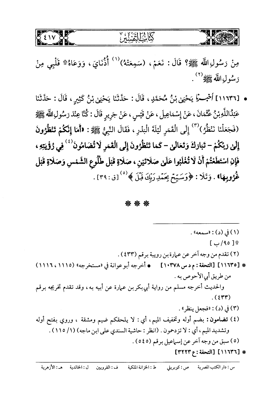 11636- أَخبَرنا يَحيَى بنُ مُحَمدٍ، قَالَ: حَدثنا يَحيَى بنُ كَثِيرٍ، قَالَ: حَدثنا عَبدُ اللهِ بنُ عُثْمَانَ، عَن إِسمَاعِيلَ، عَن قَيسٍ، عَن جَرِيرٍ، قَالَ: كُنَّا عِنْدَ رَسُولِ اللهِ صَلى الله عَليه وسَلم، فَجَعَلْنَا نَنْظُرُ إِلَى القَمَرِ لَيْلَةَ البَدْرِ، فَقَالَ النَّبيُّ صَلى الله عَليه وسَلم: أَمَا إِنَّكُمْ تَنْظُرُونَ إِلَى رَبِّكَمْ تبارك وتعالى كَمَا تَنْظُرُونَ إِلَى القَمَرِ، لا تُضَامُّونَ فِي رُؤْيَتِهِ، فَإِنِ اسْتَطَعْتُمْ أَنْ لا تُغْلَبُوا عَلَى صَلاتَيْنِ: صَلاةٍ قَبْلَ طُلُوعِ الشَّمْسِ، وَصَلاةٍ قَبْلَ غُرُوبِهَا، وَتَلا: {وَسَبِّحْ بِحَمْدِ رَبِّكَ قَبْلَ ... }.