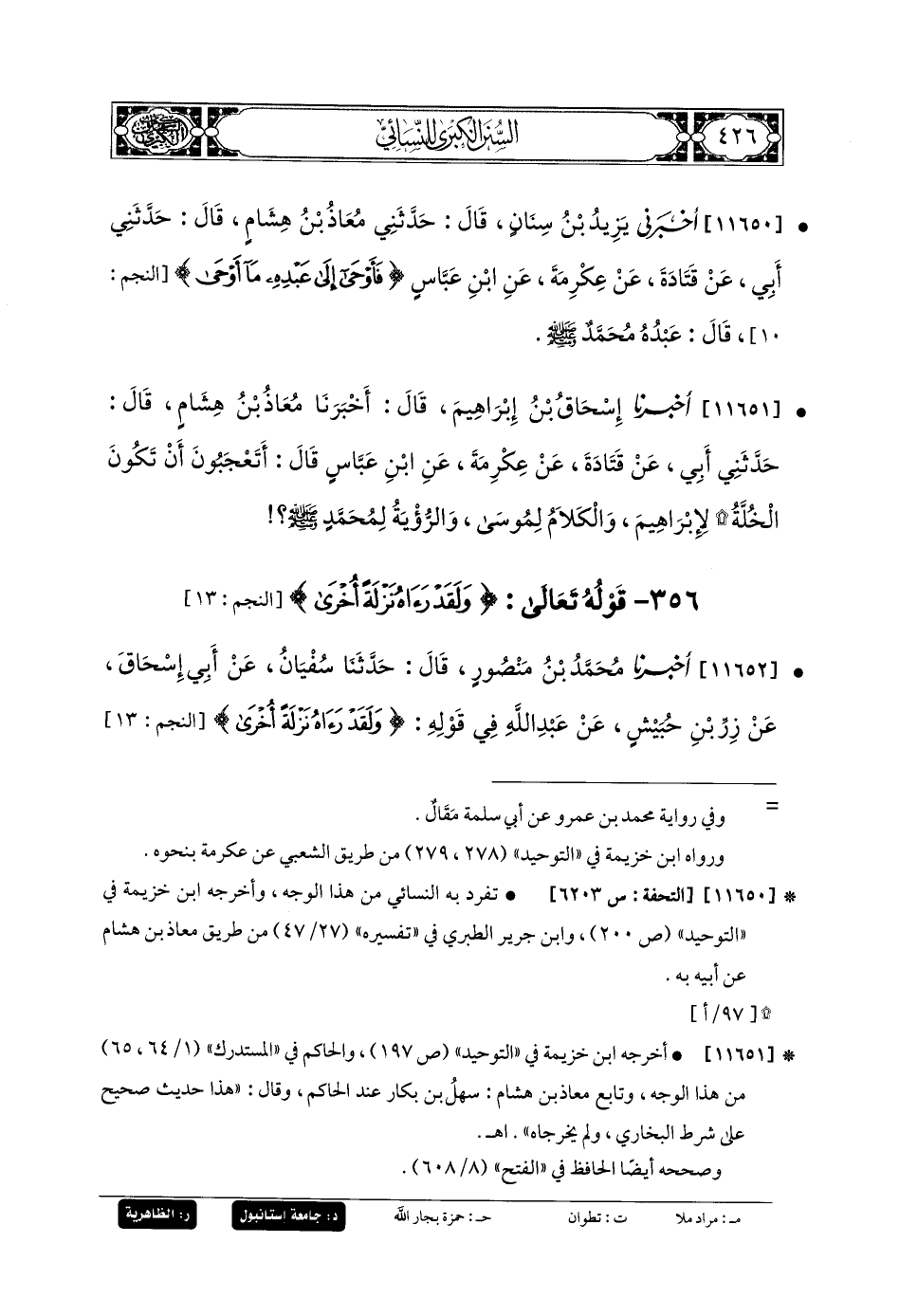 11650- أَخبَرني يَزِيدُ بنُ سِنَانٍ، قَالَ: حَدَّثني مُعَاذُ بنُ هِشَامٍ، قَالَ: حَدَّثني أَبي، عَن قَتَادَةَ، عَن عِكْرِمَةَ، عَنِ ابنِ عَبَّاسٍ، {فَأَوْحَى إِلَى عَبدِهِ مَا أَوْحَى} قَالَ: عَبدُهُ مُحَمدٌ صَلى الله عَليه وسَلم.