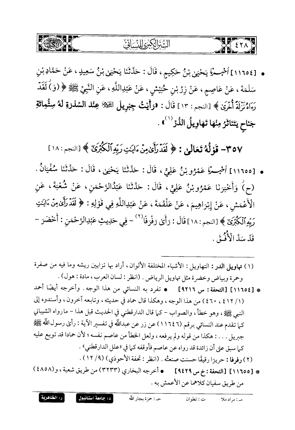 11654- أَخبَرنا يَحيَى بنُ حَكِيمٍ، حَدثنا يَحيَى بنُ سَعِيدٍ، عَن حَمَّادِ بنِ سَلَمَةَ، عَن عَاصِمٍ، عَن زِرِّ بنِ حُبَيْشٍ، عَن عَبدِ اللهِ، عَنِ النَّبيِّ صَلى الله عَليه وسَلم: {وَلَقَدْ رَآهُ نَزْلَةً أُخْرَى} قَالَ: رَأَيْتُ جِبْرِيلَ عليه السلام عِنْدَ السِّدْرَةِ، لَهُ سِتُّمِئَةِ جِنَاحٍ، يَتَنَاثَرُ مِنْهَا تَهَاوِيلُ الدُّرِّ.