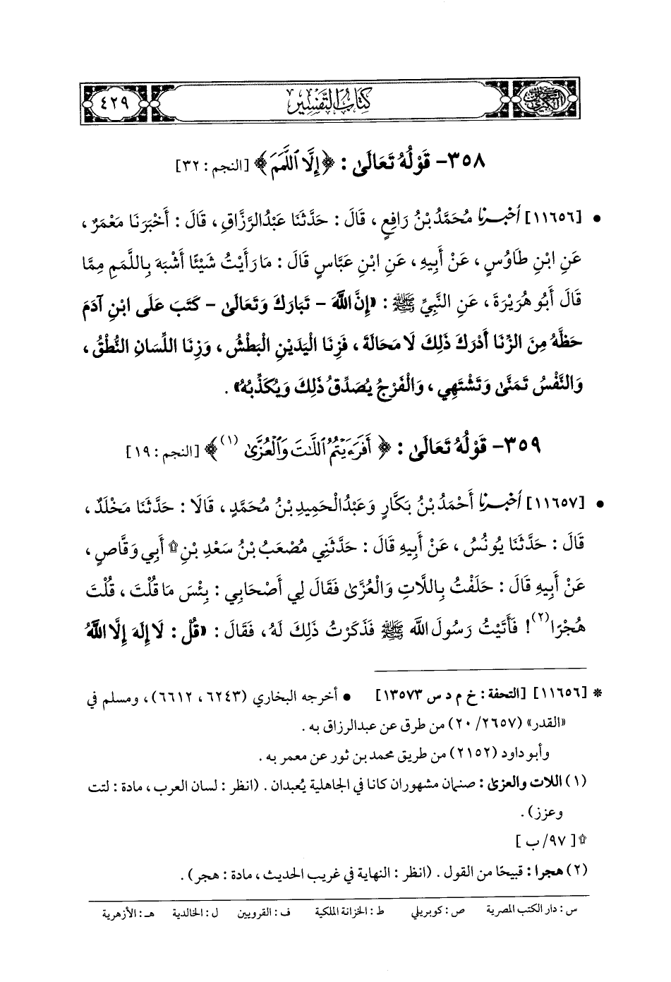 11656- أَخبَرنا مُحَمدُ بنُ رَافِعٍ، قَالَ: حَدثنا عَبدُ الرَّزَّاقِ، قَالَ: أَخبَرنا مَعْمَرٌ، عَنِ ابنِ طَاوُوسٍ، عَن أَبيهِ، عَنِ ابنِ عَبَّاسٍ قَالَ: مَا رَأَيْتُ شَيْئًا أَشْبَهَ بِاللَّمَمِ مِمَّا قَالَ أَبو هُرَيرَةَ عَنِ النَّبيِّ صَلى الله عَليه وسَلم: إِنَّ اللهَ تَبَارَكَ وَتَعَالَى كَتَبَ عَلَى ابنِ آدَمَ حَظَّهُ مِنَ الزِّنَا، أَدْرَكَ ذَلِكَ لا مَحَالَةَ، فَزِنَا اليَدَيْنِ البَطْشُ، وَزِنَا اللِّسَانِ النُّطْقُ، وَالنَّفْسُ تَمَنَّى وَتَشْتَهِي، وَالفَرْجُ يُصَدِّقُ ذَلِكَ وَيُكَذِّبُهُ.