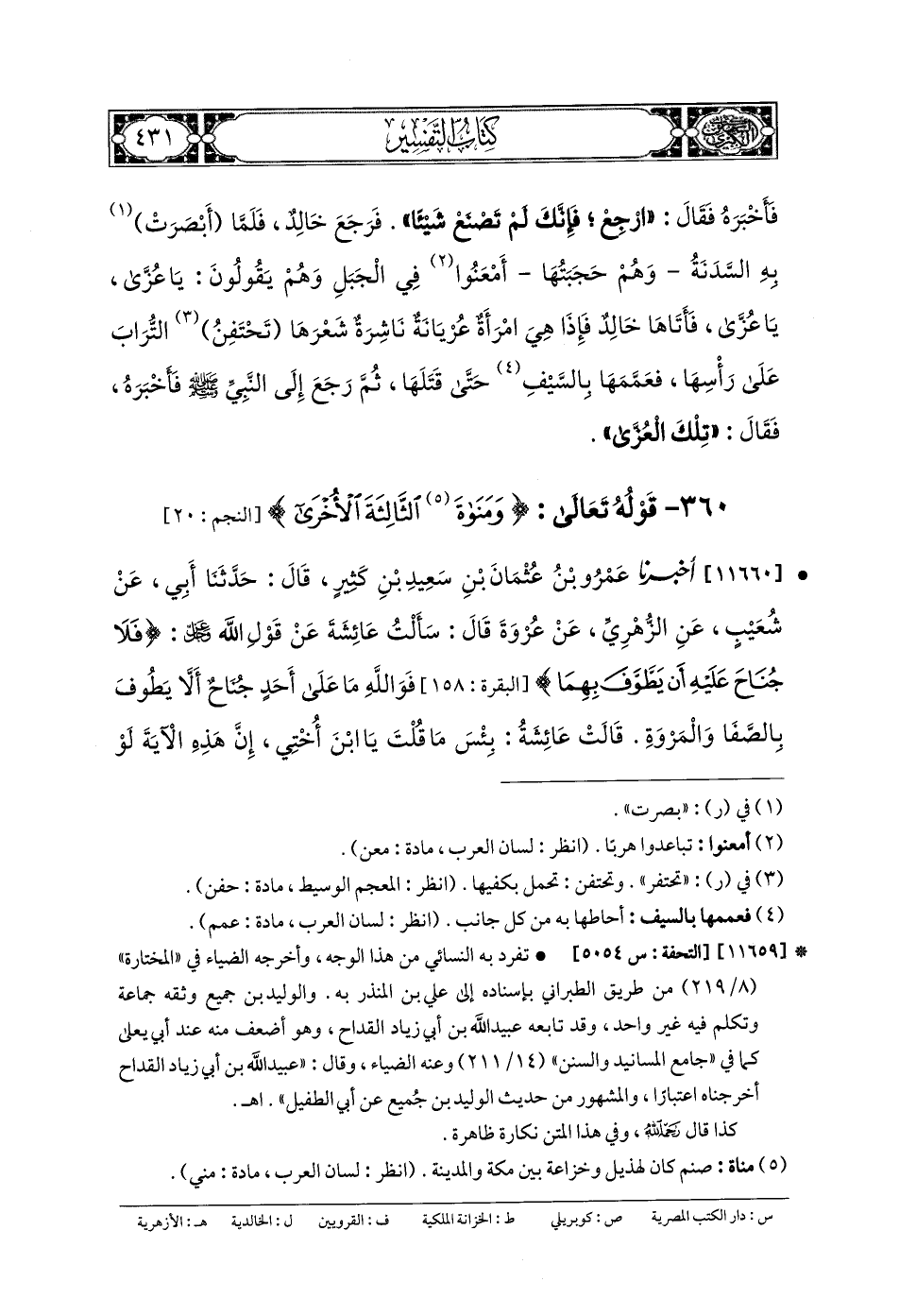 11660- أَخبَرنا عَمرُو بنُ عُثْمَانَ بنِ سَعِيدِ بنِ كَثِيرٍ، قَالَ: حَدثنا أَبي، عَن شُعَيبٍ، عَنِ الزُّهْرِيِّ، عَن عُرْوَةَ، قَالَ: سَأَلْتُ عَائِشَةَ عَن قَوْلِ اللهِ عَزَّ وَجَلَّ: {فَلا جُنَاحَ عَلَيْهِ أَنْ يَطَّوَّفَ بِهِمَا}، فَوَاللَّهِ مَا عَلَى أَحَدٍ جُنَاحٌ أَلاَّ يَطَّوَّفَ بِالصَّفَا وَالمَرْوَةِ، قَالَتْ عَائِشَةُ: بِئْسَ مَا قُلْتَ يَا ابنَ أُخْتِي، إِنَّ هَذِهِ الآيَةَ لَوْ كَانَتْ كَمَا أَوَّلْتَهَا، كَانَتْ: لا جُنَاحَ عَلَيْهِ أَلاَّ يَطَّوَّفَ بِهِمَا، وَلَكِنَّهَا أُنْزِلَتْ فِي أَنَّ الأَنْصَارَ قَبْلَ أَنْ يُسْلِمُوا، كَانُوا يُهِلُّونَ لِمَنَاةَ الطَّاغِيَةِ الَّتِي كَانُوا يَعْبُدُونَ عِنْدَ المُشَلَّلِ، وَكَانَ مَنْ أَهَلَّ لَهَا يَتَحَرَّجُ أَنْ يَطَّوَّفَ بِالصَّفَا وَالمَرْوَةِ، فَلَمَّا سَأَلُوا رَسُولَ اللهِ صَلى الله عَليه وسَلم عَن ذَلِكَ، أَنْزَلَ اللهُ عَزَّ وَجَلَّ: {إِنَّ الصَّفَا وَالمَرْوَةَ مِنْ شَعَائِرِ اللهِ فَمَنْ حَجَّ البَيْتَ أَوِ اعْتَمَرَ فَلا جُنَاحَ عَلَيْهِ أَنْ يَطَّوَّفَ بِهِمَا}، ثُمَّ قَدْ سَنَّ رَسُولُ اللهِ صَلى الله عَليه وسَلم الطَّوَافَ بِهِمَا، فَلَيْسَ لأَحَدٍ أَنْ يَتْرُكَ الطَّوَافَ بِهِمَا.