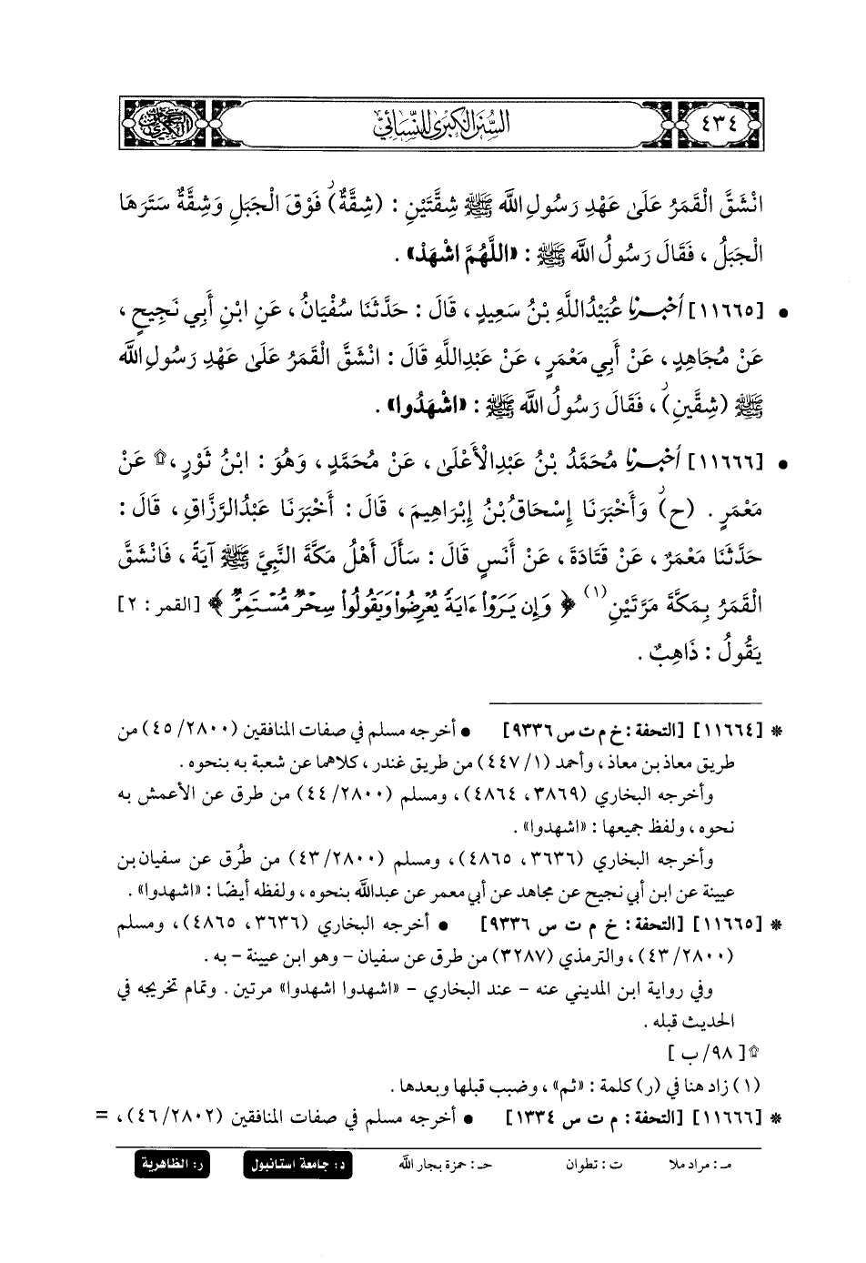 11665- أَخبَرنا عُبَيدُ اللهِ بنُ سَعِيدٍ، قَالَ: حَدثنا سُفيانُ، عَنِ ابنِ أَبي نَجِيحٍ، عَن مُجَاهِدٍ، عَن أَبي مَعْمَرٍ، عَن عَبدِ اللهِ، قَالَ: انْشَقَّ القَمَرُ عَلَى عَهْدِ رَسُولِ اللهِ صَلى الله عَليه وسَلم شِقَّيْنِ، فَقَالَ رَسُولُ اللهِ صَلى الله عَليه وسَلم: اشْهَدُوا.