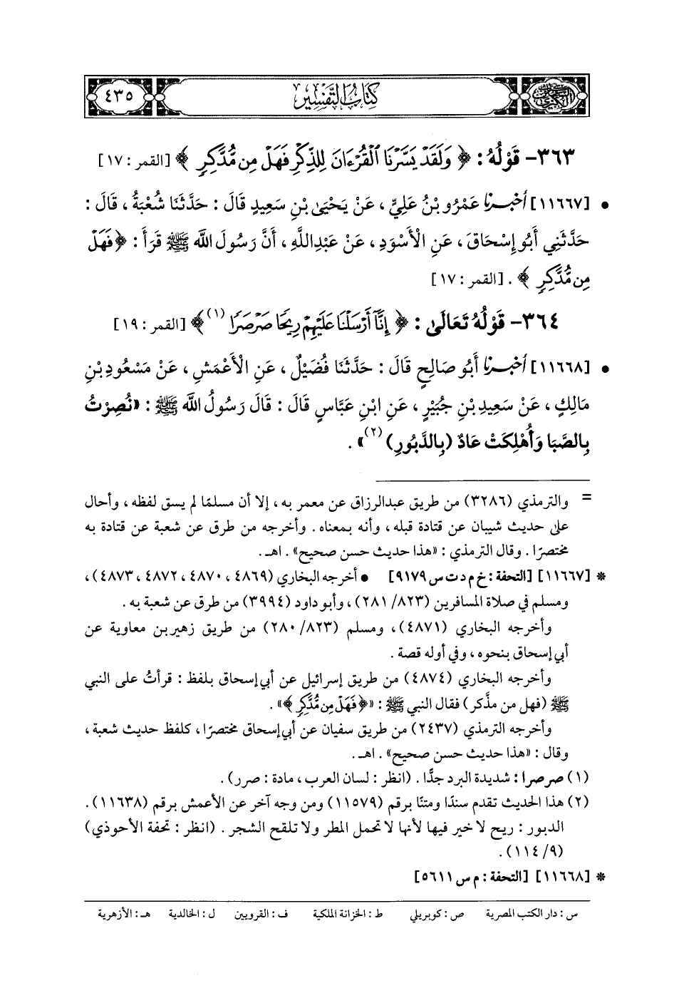 364- قَوْلُهُ تَعَالَى: {إِنَّا أَرْسَلْنَا عَلَيْهِمْ رِيحًا صَرْصَرًا}.