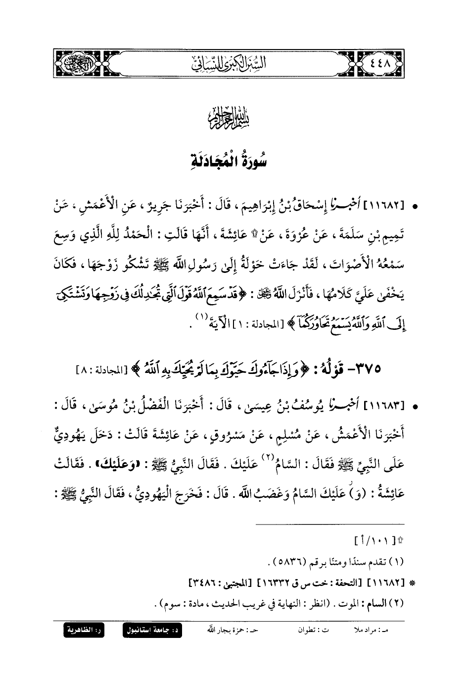 11683- أَخبَرنا يُوسُفُ بنُ عِيسَى، قَالَ: أَخبَرنا الفَضْلُ بنُ مُوسَى، قَالَ: أَخبَرنا الأَعْمَشُ، عَن مُسْلِمٍ، عَن مَسْرُوقٍ، عَن عَائِشَةَ، قَالَتْ: دَخَلَ يَهُودِيٌّ عَلَى النَّبيِّ صَلى الله عَليه وسَلم فَقَالَ: السَّامُ عَلَيْكَ، فَقَالَ النَّبيُّ صَلى الله عَليه وسَلم: وَعَلَيْكَ، فَقَالَتْ عَائِشَةُ: وَعَلَيْكَ السَّامُ وَغَضَبُ اللهِ، قَالَ: فَخَرَجَ اليَهُودِيُّ، فَقَالَ النَّبيُّ صَلى الله عَليه وسَلم: يَا عَائِشَةُ، إِنَّ اللهَ تبارك وتعالى لا يُحِبُّ الفَاحِشَ المُتَفَحِّشَ، قَالَتْ: يَا رَسُولَ اللهِ، أَمَّا تَدْرِي مَا قَالَ؟ قَالَ: وَمَا قَالَ؟ قَالَتْ: قَالَ: السَّامُ عَلَيْكَ، فَهُوَ قَوْلُهُ: {وَإِذَا جَاؤوكَ حَيَّوْكَ بِمَا لَمْ يُحَيِّكَ بِهِ اللهُ}، قَالَ: فَخَرَجَ اليَهُودِيُّ وَهُوَ يَقُولُ بَيْنَهُ وَبَيْنَ نَفْسِهِ، فَأَنْزَلَ اللهُ عَزَّ وَجَلَّ: {وَيَقُولُونَ فِي أَنْفُسِهِمْ لَوْلا يُعَذِّبُنَا اللهُ بِمَا نَقُولُ حَسْبُهُمْ جَهَنَّمُ يَصْلَونَهَا فَبِئْسَ المَصِيرُ}.