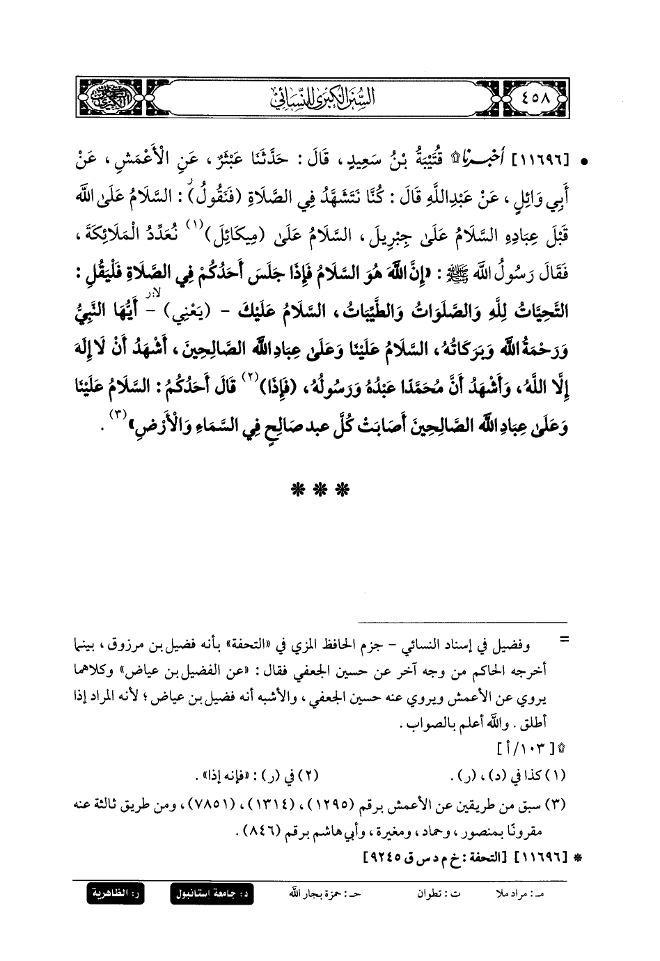 11696- أَخبَرنا قُتَيبَةُ بنُ سَعِيدٍ، قَالَ: حَدثنا عَبْثَرٌ، عَنِ الأَعْمَشِ، عَن أَبي وَائِلٍ، عَن عَبدِ اللهِ، قَالَ: كُنَّا نَتَشَهَّدُ فِي الصَّلاةِ، فَنَقُولُ: السَّلامُ عَلَى اللهِ قَبْلَ عِبَادِهِ، السَّلامُ عَلَى جِبْرِيلَ، السَّلامُ عَلَى مِيكَائِيلَ، نُعَدِّدُ المَلائِكَةَ، فَقَالَ رَسُولُ اللهِ صَلى الله عَليه وسَلم: إِنَّ اللهَ هُوَ السَّلامُ، فَإِذَا جَلَسَ أَحَدُكُمْ فِي الصَّلاةِ، فَلْيَقُلِ: التَّحِيَّاتُ للهِ، وَالصَّلَوَاتُ وَالطَّيِّبَاتُ، السَّلامُ عَلَيْكَ يعني أَيُّهَا النَّبيُّ، وَرَحْمَةُ اللهِ وَبَرَكَاتُهُ، السَّلامُ عَلَيْنَا، وَعَلَى عِبَادِ اللهِ الصَّالِحِينَ، أَشْهَدُ أَنْ لا إِلَهَ إِلاَّ اللهُ، وَأَشْهَدُ أَنَّ مُحَمدًا عَبدُهُ وَرَسُولُهُ، فَإِنَّهُ إِذَا قَالَ أَحَدُكُمُ: السَّلامُ عَلَيْنَا وَعَلَى عِبَادِ اللهِ الصَّالِحِينَ، أَصَابَتْ كُلَّ عَبدٍ صَالِحٍ فِي السَّمَاءِ وَالأَرْضِ.