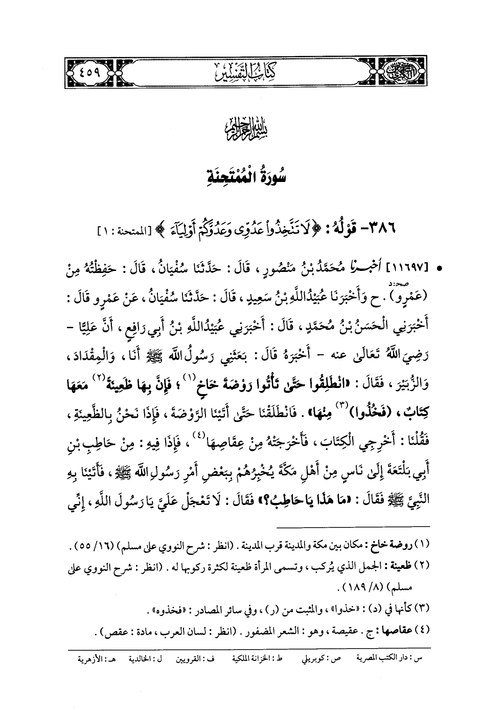 11697 - أَخبَرنا مُحَمدُ بنُ مَنصُورٍ، قَالَ: حَدثنا سُفيانُ، قَالَ: حَفِظْتُهُ عَن عَمْرٍو (ح) وَأَخبَرنا عُبَيدُ اللهِ بنُ سَعِيدٍ، قَالَ: حَدثنا سُفيانُ، عَن عَمْرٍو، قَالَ: أَخبَرني الحَسَنُ بنُ مُحَمدٍ، قَالَ: أَخبَرني عُبَيدُ اللهِ بنُ أَبي رَافِعٍ، أَنَّ عَليًّا رضي الله تعالى عنه أَخبَرَهُ، قَالَ: بَعَثَنِي رَسُولُ اللهِ صَلى الله عَليه وسَلم، أَنَا وَالمِقْدَادُ، وَالزُّبَيْرُ، فَقَالَ: انْطَلِقُوا حَتَّى تَأْتُوا رَوْضَةَ خَاخٍ، فَإِنَّ بِهَا ظَعِينَةً مَعَهَا كِتَابٌ، فَخُذُوا مِنْهَا، فَانْطَلَقْنَا حَتَّى أَتَيْنَا الرَّوْضَةَ، فَإِذَا نَحْنُ بِالظَّعِينَةِ، فَقُلْنَا: أَخْرِجِي الكِتَابَ، فَأَخْرَجَتْهُ مِنْ عِقَاصِهَا، فَإِذَا فِيهِ: مِنْ حَاطِبِ بنِ أَبي بَلْتَعَةَ إِلَى نَاسٍ مِنْ أَهْلِ مَكَّةَ، يُخْبِرُهُمْ بِبَعْضِ أَمْرِ رَسُولِ اللهِ صَلى الله عَليه وسَلم، فَأَتَيْنَا بِهِ النَّبيَّ صَلى الله عَليه وسَلم، فَقَالَ: مَا هَذَا يَا حَاطِبُ؟ فَقَالَ: لا تَعْجَلْ عَلَيَّ يَا رَسُولَ اللهِ، إِنِّي كُنْتُ امْرَءًا مُلْصَقًا بِقُرَيْشٍ، وَلَمْ أَكُنْ مِنْ أَنْفُسِهِمْ، وَكَانَ مَنْ مَعَكَ لَهُمْ بِهَا قَرَابَاتٌ يَحْمُونَ بِهَا قَرَابَتَهُمْ، فَأَحْبَبْتُ إِذْ فَاتَنِي ذَلِكَ مِنَ النَّسَبِ أَنْ أَتَقَرَّبَ إِلَيْهِمْ بِيَدٍ يَحْمُونَ بِهَا قَرَابَتِي، وَمَا فَعَلْتُهُ كُفْرًا وَلا ارْتِدَادًا عَن دِينِي، وَلا رِضًى بِالكُفْرِ بَعْدَ الإِسلامِ، فَقَالَ النَّبيُّ صَلى الله عَليه وسَلم: قَدْ صَدَقَكُمْ، فَقَالَ عُمَرُ: يَا رَسُولَ اللهِ، دَعْنِي أَضْرِبْ عُنُقَ، يَعْنِي هَذَا، فَقَالَ: يَا عُمَرُ، مَا يُدْرِيكَ، لَعَلَّ اللهَ اطَّلَعَ عَلَى أَهْلِ بَدْرٍ فَقَالَ: اعْمَلُوا مَا شِئْتُمْ، فَقَدْ غَفَرْتُ لَكُمْ.