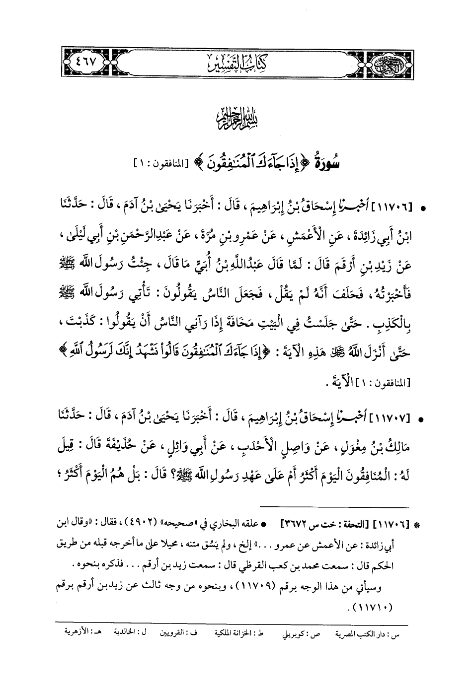 11706- أَخبَرنا إِسحَاقُ بنُ إِبرَاهِيمَ، قَالَ: أَخبَرنا يَحيَى بنُ آدَمَ، قَالَ: حَدثنا ابنُ أَبي زَائِدَةَ، عَنِ الأَعْمَشِ، عَن عَمْرِو بنِ مُرَّةَ، عَن عَبدِ الرَّحمَنِ بنِ أَبي لَيْلَى، عَن زَيْدِ بنِ أَرْقَمَ، قَالَ: لَمَّا قَالَ عَبدُ اللهِ بنُ أُبَيٍّ مَا قَالَ، جِئْتُ رَسُولَ اللهِ صَلى الله عَليه وسَلم فَأَخبَرْتُهُ، فَحَلَفَ أَنَّهُ لَمْ يَقُلْ، فَجَعَلَ النَّاسُ يَقُولُونَ: تَأْتِي رَسُولَ اللهِ صَلى الله عَليه وسَلم بِالكَذِبِ؟ حَتَّى جَلَسْتُ فِي البَيْتِ مَخَافَةَ إِذَا رَآنِي النَّاسُ أَنْ يَقُولُوا: كَذَبْتَ، حَتَّى أَنْزَلَ اللهُ عَزَّ وَجَلَّ هَذِهِ الآيَةَ: {إِذَا جَاءَكَ المُنَافِقُونَ قَالُوا نَشْهَدُ إِنَّكَ لَرَسُولِ اللهِ} الآيَةَ.