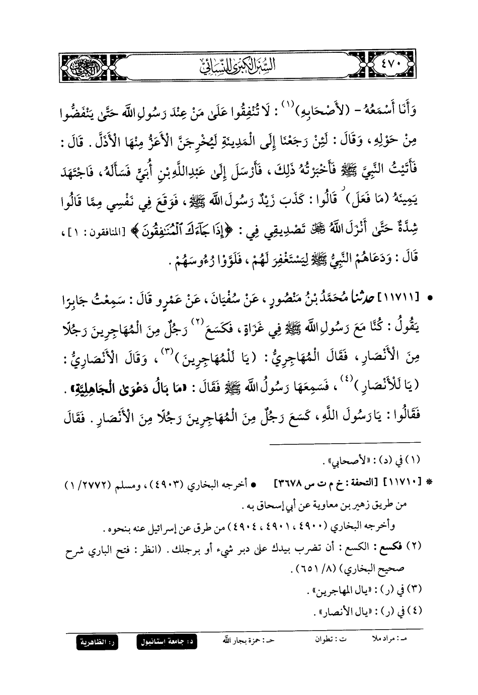 11711- أَخبَرنا مُحَمدُ بنُ مَنصُورٍ، عَن سُفيانَ، عَن عَمْرٍو، قَالَ: سَمِعْتُ جَابِرًا يَقُولُ: كُنَّا مَعَ رَسُولِ اللهِ صَلى الله عَليه وسَلم فِي غَزَاةٍ، فَكَسَعَ رَجُلٌ مِنَ المُهَاجِرِينَ رَجُلاً مِنَ الأَنْصَارِ، فَقَالَ المُهَاجِرِيُّ: يَا لَلْمُهَاجِرِينَ، وَقَالَ الأَنْصَارِيُّ: يَا لَلأَنْصَارِ، فَسَمِعَهَا رَسُولُ اللهِ صَلى الله عَليه وسَلم، فَقَالَ: مَا بَالَ دَعْوَى الجَاهِلِيَّةِ، قَالُوا: يَا رَسُولَ اللهِ، كَسَعَ رَجُلٌ مِنَ المُهَاجِرِينَ رَجُلاً مِنَ الأَنْصَارِ، فَقَالَ رَسُولُ اللهِ صَلى الله عَليه وسَلم: دَعُوهَا فَإِنَّهَا مُنْتِنَةٌ، فَبَلَغَ ذَلِكَ عَبدَ اللهِ بْنَ أُبَيٍّ ابنَ سَلُولٍ، فَقَالَ: فَعَلُوهَا؟ {لَئِنْ رَجَعْنَا إِلَى المَدِينَةِ لَيُخْرِجَنَّ الأَعَزُّ مِنْهَا الأَذَلَّ}، فَقَالَ عُمَرُ: دَعْنِي أَضْرِبْ عُنُقَ هَذَا، قَالَ رَسُولُ اللهِ صَلى الله عَليه وسَلم: لا يَتَحَدَّثَنَّ النَّاسُ أَنَّ مُحَمدًا يَقْتُلُ أَصْحَابَهُ.