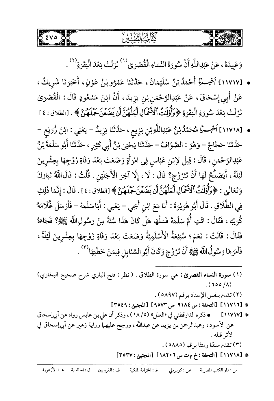 11717- أَخبَرنا أَحْمَدُ بنُ سُلَيمَانَ، حَدثنا عَمرُو بنُ عَوْنٍ، أَخبَرنا شَرِيكٌ، عَن أَبي إِسحَاقَ، عَن عَبدِ الرَّحمَنِ بنِ يَزِيدَ، أَنَّ ابنَ مَسْعُودٍ قَالَ: القُصْرَى نَزَلَتْ بَعْدَ سُورَةِ البَقَرَةِ: {وَأُولاتُ الأَحْمَالِ أَجَلُهُنَّ أَنْ يَضَعْنَ حَمَلَهُنَّ}.