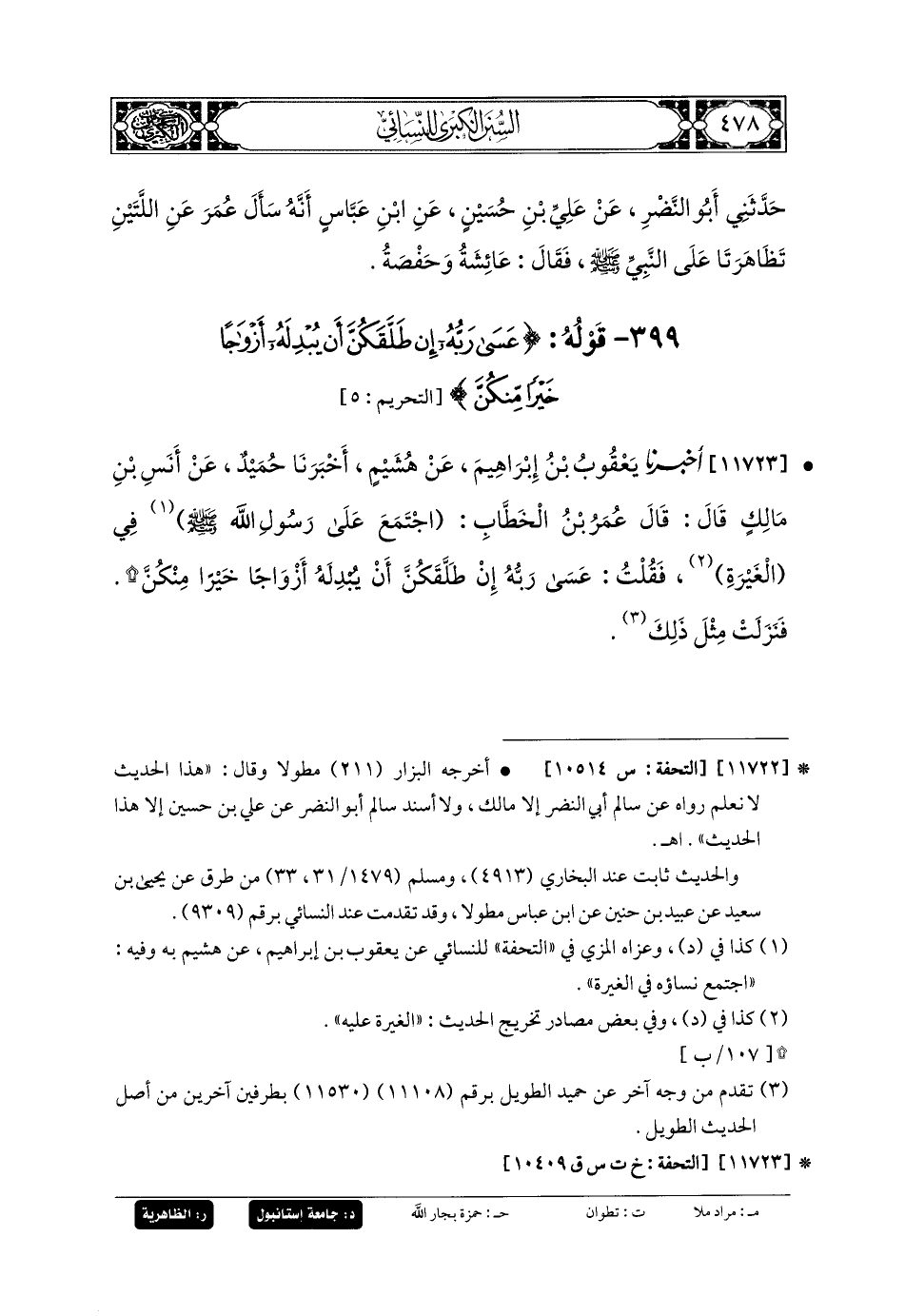 11723- أَخبَرنا يَعقُوبُ بنُ إِبرَاهِيمَ، عَن هُشَيْمٍ، أَخبَرنا حُمَيْدٌ، عَن أَنَسِ بنِ مَالِكٍ، قَالَ: قَالَ عُمَرُ بنُ الخَطَّابِ: اجْتَمَعَ عَلَى رَسُولِ اللهِ صَلى الله عَليه وسَلم نِسَاؤُهُ (1) فِي الغَيْرَةِ عَلَيْهِ (2)، فَقُلْتُ: {عَسَى رَبُّهُ إِنْ طَلَّقَكُنَّ أَنْ يُبْدِلَهُ أَزْوَاجًا خَيْرًا مِنْكُنَّ} فَنَزَلَتْ مِثْلَ ذَلِكَ.