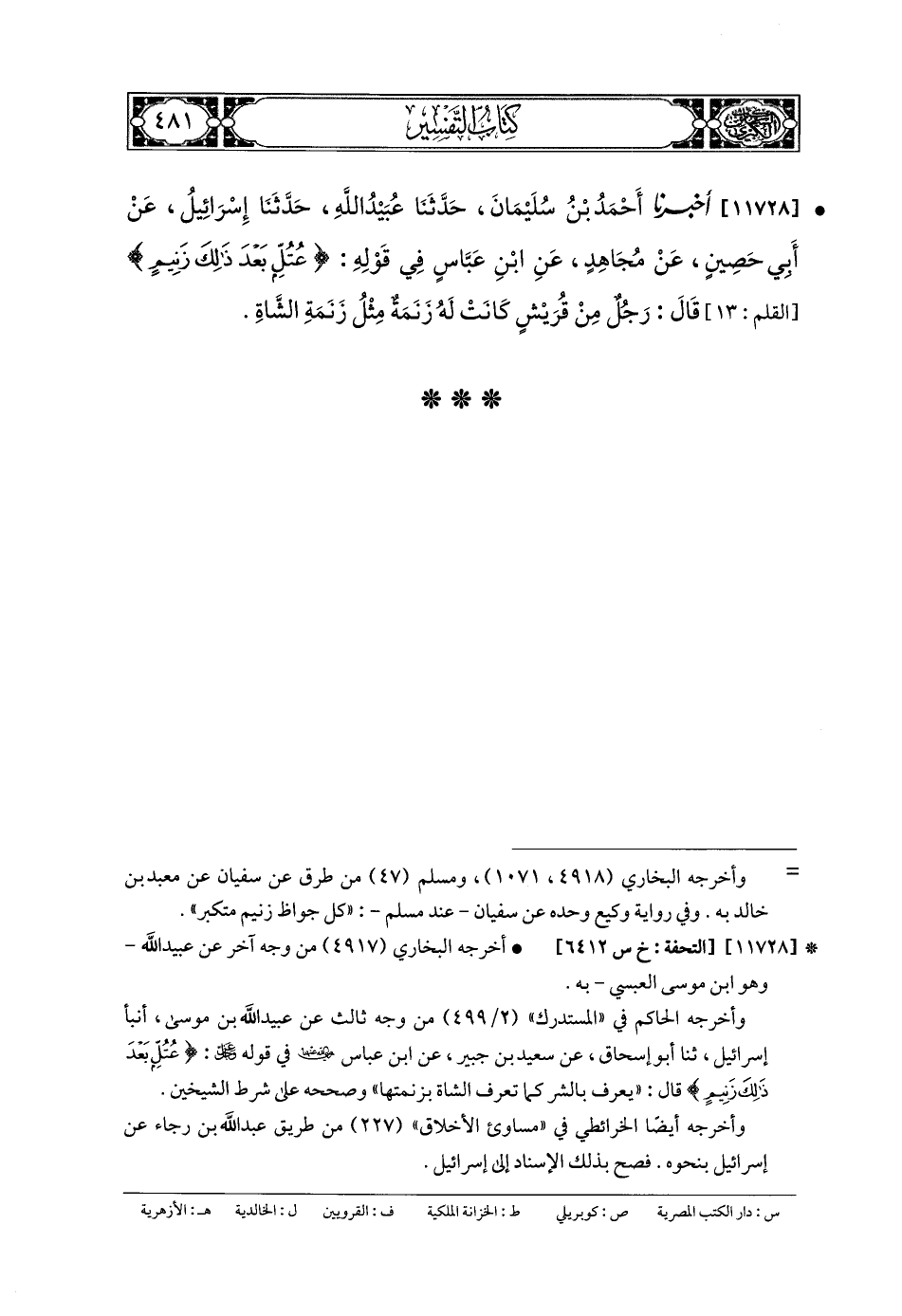11728- أَخبَرنا أَحْمَدُ بنُ سُلَيمَانَ، حَدثنا عُبَيدُ اللهِ، حَدثنا إِسرَائِيلُ، عَن أَبي حَصِيْنٍ، عَن مُجَاهِدٍ، عَنِ ابنِ عَبَّاسٍ، فِي قَوْلِهِ: {عُتُلٍّ بَعْدَ ذَلِكَ زَنِيمٍ}، قَالَ: رَجُلٌ مِنْ قُرَيْشٍ كَانَتْ لَهُ زَنَمَةٌ مِثْلُ زَنَمَةِ الشَّاةِ.