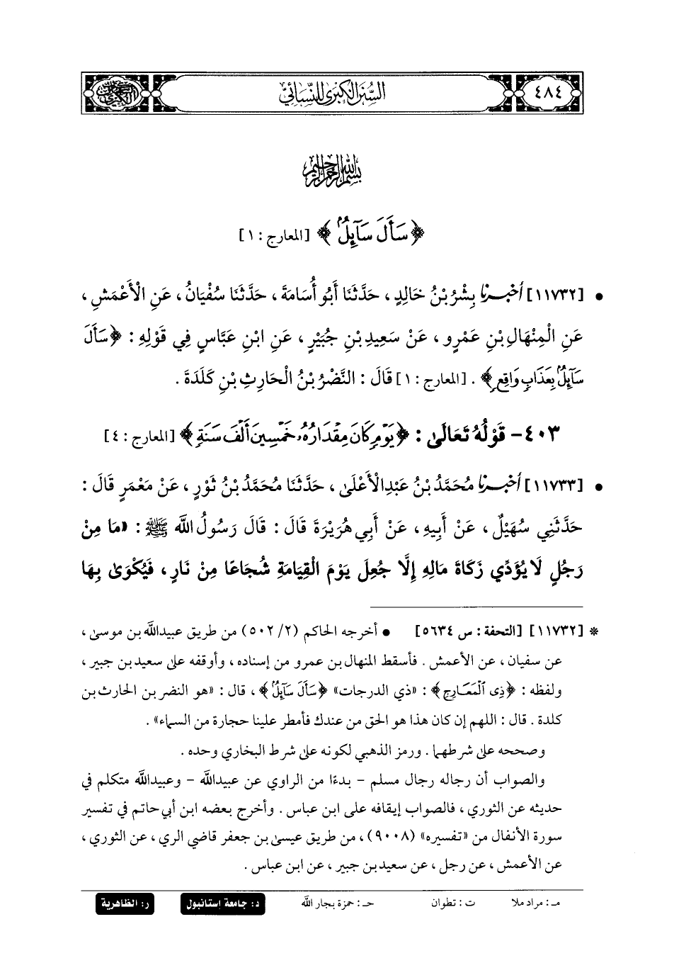11732- أَخبَرنا بِشْرُ بنُ خَالِدٍ، حَدثنا أَبو أُسَامَةَ، حَدثنا سُفيانُ، عَنِ الأَعْمَشِ، عَنِ المِنْهَالِ بنِ عَمْرٍو، عَن سَعِيدِ بنِ جُبَيرٍ، عَنِ ابنِ عَبَّاسٍ، فِي قَوْلِهِ: {سَأَلَ سَائِلٌ بِعَذَابٍ وَاقِعٍ}، قَالَ: النَّضْرُ بنُ الحَارِثِ بنِ كَلَدَةَ.