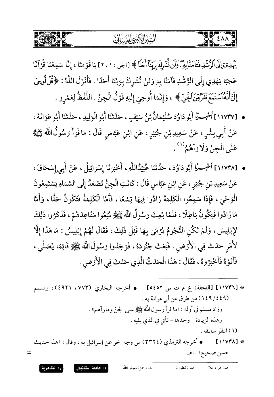 11737- أَخبَرنا أَبو دَاوُدَ سُلَيمَانُ بنُ سَيْفٍ، حَدثنا أَبو الوَلِيدِ، حَدثنا أَبو عَوَانَةَ، عَن أَبي بِشْرٍ، عَن سَعِيدِ بنِ جُبَيرٍ، عَنِ ابنِ عَبَّاسٍ، قَالَ: مَا قَرَأَ رَسُولُ اللهِ صَلى الله عَليه وسَلم عَلَى الجِنِّ وَلا رَآهُمْ.