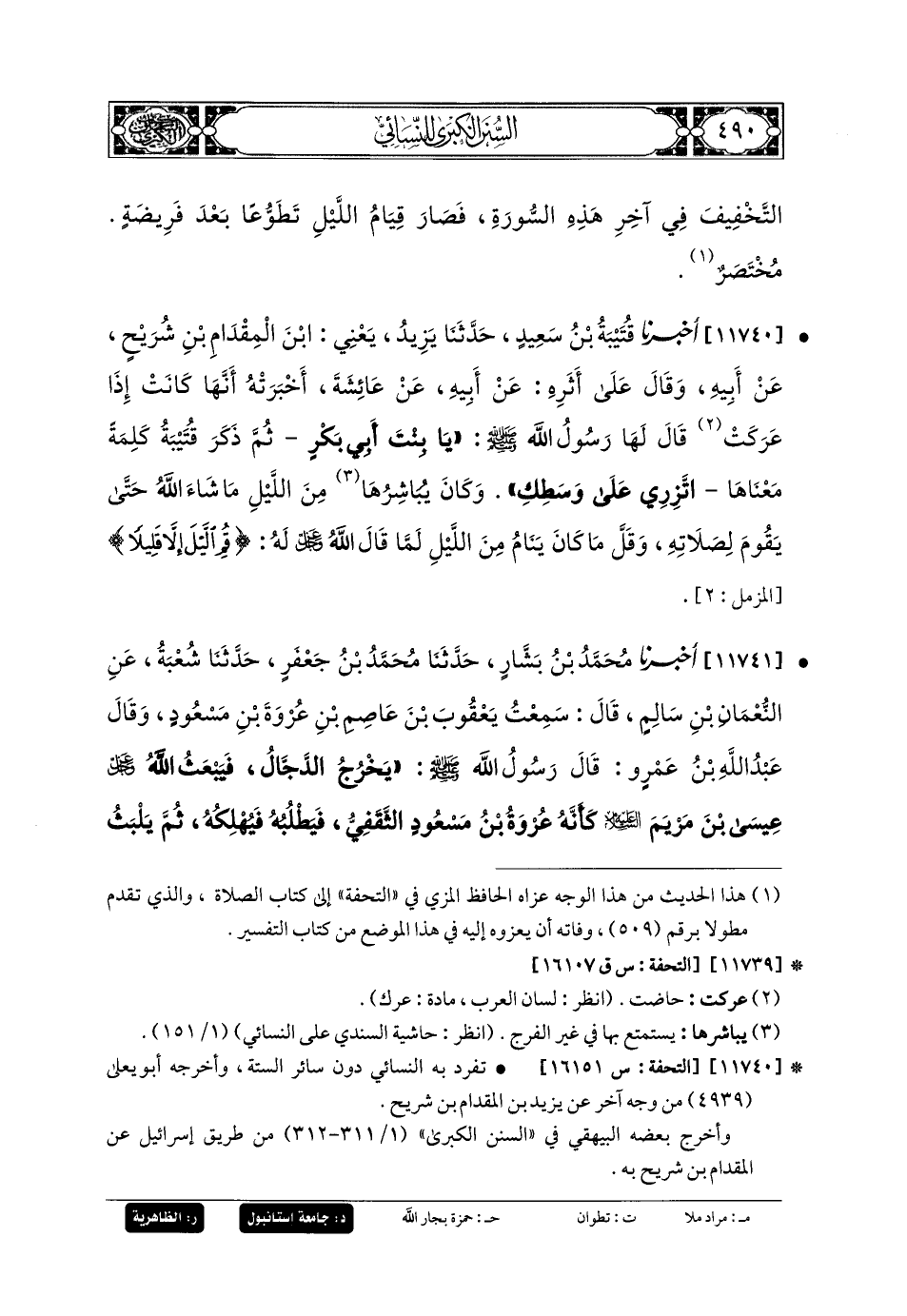 11740- أَخبَرنا قُتَيبَةُ بنُ سَعِيدٍ، حَدثنا يَزِيدُ، يَعْنِي ابنَ المِقْدَامِ بنِ شُرَيْحٍ، عَن أَبيهِ، وَقَالَ عَلَى أَثَرِهِ: عَن أَبيهِ، عَن عَائِشَةَ أَخبَرَتْهُ، أَنَّهَا كَانَتْ إِذَا عَرَكَتْ، قَالَ لَهَا رَسُولُ اللهِ صَلى الله عَليه وسَلم: يَا بِنْتَ أَبي بَكْرٍ، ثُمَّ ذَكَرَ قُتَيبَةُ كَلِمَةً مَعْنَاهَا، اتَّزِرِي عَلَى وَسَطِكِ، وَكَانَ يُبَاشِرُهَا مِنَ اللَّيْلِ مَا شَاءَ اللهُ حَتَّى يَقُومَ لَصَلاتِهِ، وَقَلَّمَا كَانَ يَنَامُ مِنَ اللَّيْلِ، لَمَّا قَالَ اللهُ عَزَّ وَجَلَّ لَهُ: {قُمِ اللَّيْلَ إِلاَّ قَلِيلاً}.