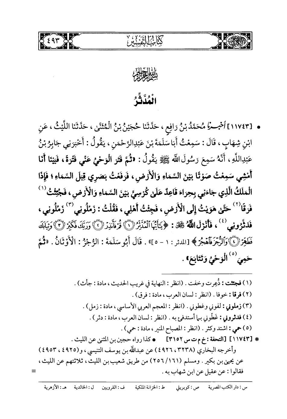 11743- أَخبَرنا مُحَمدُ بنُ رَافِعٍ، حَدثنا حُجَيْنُ بنُ المُثَنَّى، حَدثنا اللَّيْثُ، عَنِ ابنِ شِهَابٍ، قَالَ: سَمِعْتُ أَبَا سَلَمَةَ بْنَ عَبدِ الرَّحمَنِ يَقُولُ: أَخبَرني جَابِرُ بنُ عَبدِ اللهِ، أَنَّهُ سَمِعَ رَسُولَ اللهِ صَلى الله عَليه وسَلم يَقُولُ: ثُمَّ فَتَرَ الوَحْيُ عَنِّي فَتْرَةً، فَبَيْنَمَا أَنَا أَمْشِي، سَمِعْتُ صَوْتًا بَيْنَ السَّمَاءِ وَالأَرْضِ، فَرَفَعْتُ بَصَرِي قِبَلَ السَّمَاءِ، فَإِذَا المَلَكُ الَّذِي جَاءَنِي بِحِرَاءٍ قَاعِدٌ عَلَى كُرْسِيٍّ بَيْنَ السَّمَاءِ وَالأَرْضِ، فَجُئِثْتُ فَرَقًا حَتَّى هَوَيْتُ إِلَى الأَرْضِ، فَجِئْتُ أَهْلِي، فَقُلْتُ: زَمِّلُونِي زَمِّلُونِي، فَدَثَّرُونِي، فَأَنْزَلَ اللهُ عَزَّ وَجَلَّ: {يَا أَيُّهَا المُدَّثِّرُ قُمْ فَأَنْذِرْ وَرَبَّكَ فَكَبِّرْ وَثِيَابَكَ فَطَهِّرْ وَالرُّجْزَ فَاهْجُرْ}، قَالَ أَبو سَلَمَةَ: الرُّجْزُ الأَوْثَانُ، ثُمَّ حَمِيَ الوَحْيُ وَتَتَابَعَ.