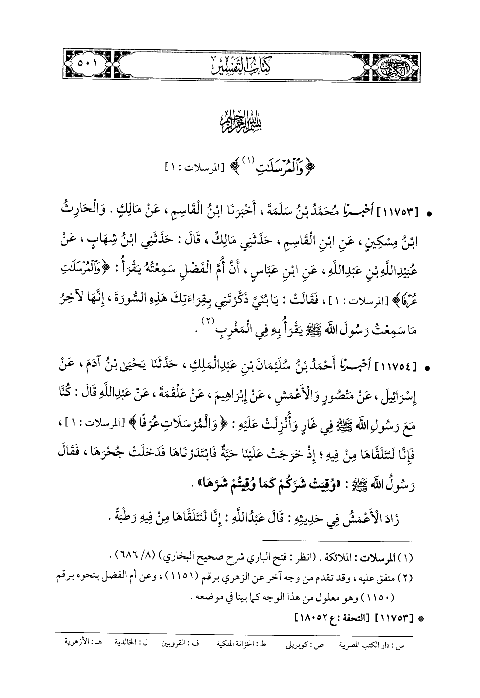 11753- أَخبَرنا مُحَمدُ بنُ سَلَمَةَ، أَخبَرنا ابنُ القَاسِمِ، عَن مَالِكٍ، وَالحَارِثُ بنُ مِسْكِينٍ، عَنِ ابنِ القَاسِمِ، حَدَّثني مَالِكٌ، قَالَ: حَدَّثني ابنُ شِهَابٍ، عَن عُبَيدِ اللهِ بنِ عَبدِ اللهِ، عَنِ ابنِ عَبَّاسٍ، أَنَّ أُمَّ الفَضْلِ سَمِعَتْهُ يَقْرَأُ: {وَالمُرْسَلاتِ عُرْفًا}، فَقَالَتْ: يَا بُنَيَّ، ذَكَّرْتَنِي بِقِرَاءَتك هَذِهِ السُّورَةَ، إِنَّهَا لآخِرُ مَا سَمِعْتُ رَسُولَ اللهِ صَلى الله عَليه وسَلم يَقْرَأُ بِهَا فِي المَغْرِبِ.