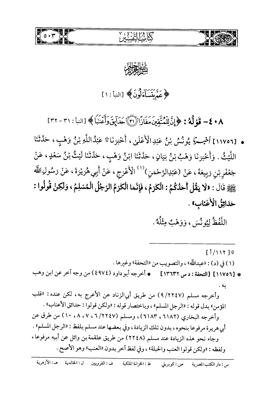 11756- أَخبَرنا يُونُسُ بنُ عَبدِ الأَعْلَى، أَخبَرنا عَبدُ اللهِ بنُ وَهْبٍ، حَدثنا اللَّيْثُ (ح) وَأَخبَرنا وَهْبُ بنُ بَيَانٍ، حَدثنا ابنُ وَهْبٍ، حَدثنا لَيْثُ بنُ سَعْدٍ، عَن جَعفَرِ بنِ رَبِيعَةَ، عَن عَبدِ الرَّحمَنِ الأَعْرَجِ، عَن أَبي هُرَيرَةَ، عَن رَسُولِ اللهِ صَلى الله عَليه وسَلم، قَالَ: لا يَقُلْ أَحَدُكُمُ: الكَرْمُ، فَإِنَّمَا الكَرْمُ الرَّجُلُ المُسْلِمُ، وَلَكِنْ قُولُوا: حَدَائِقَ الأَعْنَابِ.