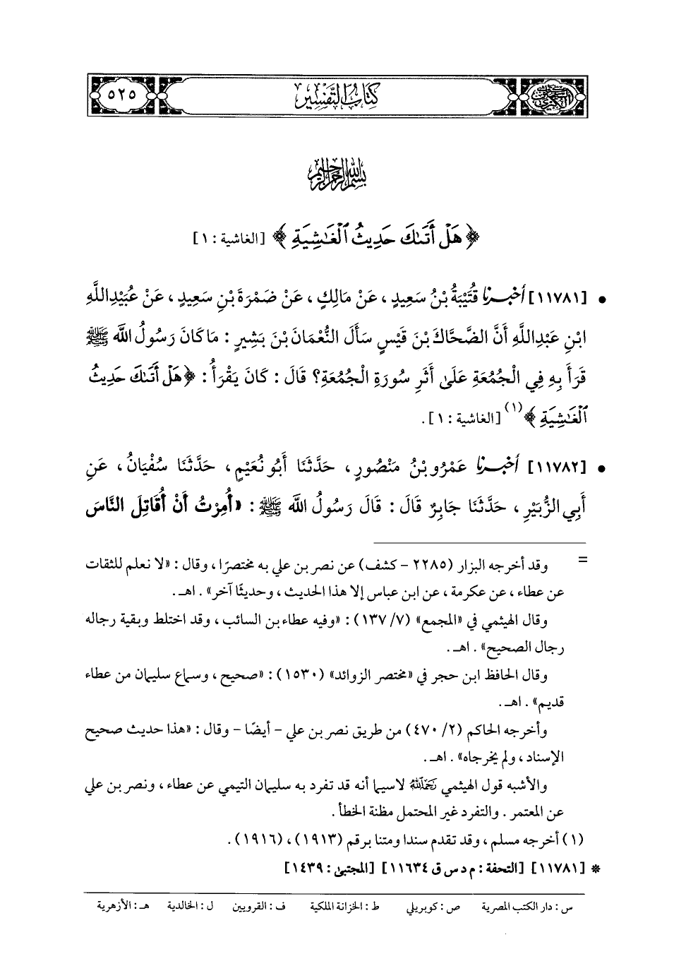 11782- أَخبَرنا عَمرُو بنُ مَنصُورٍ، حَدثنا أَبو نُعَيْمٍ، حَدثنا سُفيانُ، عَن أَبي الزُّبَيْرِ، حَدثنا جَابِرٍ، قَالَ: قَالَ رَسُولُ اللهِ صَلى الله عَليه وسَلم: أُمِرْتُ أَنْ أُقَاتِلَ النَّاسَ حَتَّى يَقُولُوا: لا إِلَهَ إِلاَّ اللهُ، فَإِذَا قَالُوا: لا إِلَهَ إِلاَّ اللهُ، عَصَمُوا مِنِّي دِمَاءَهُمْ وَأَمْوَالَهُمْ إِلاَّ بِحَقِّهَا، وَحِسَابُهُمْ عَلَى اللهِ، ثُمَّ تَلا صَلى الله عَليه وسَلم: {إِنَّمَا أَنْتَ مُذَكِّرٌ لَسْتَ عَلَيْهِمْ بِمُصَيْطِرٍ}.
