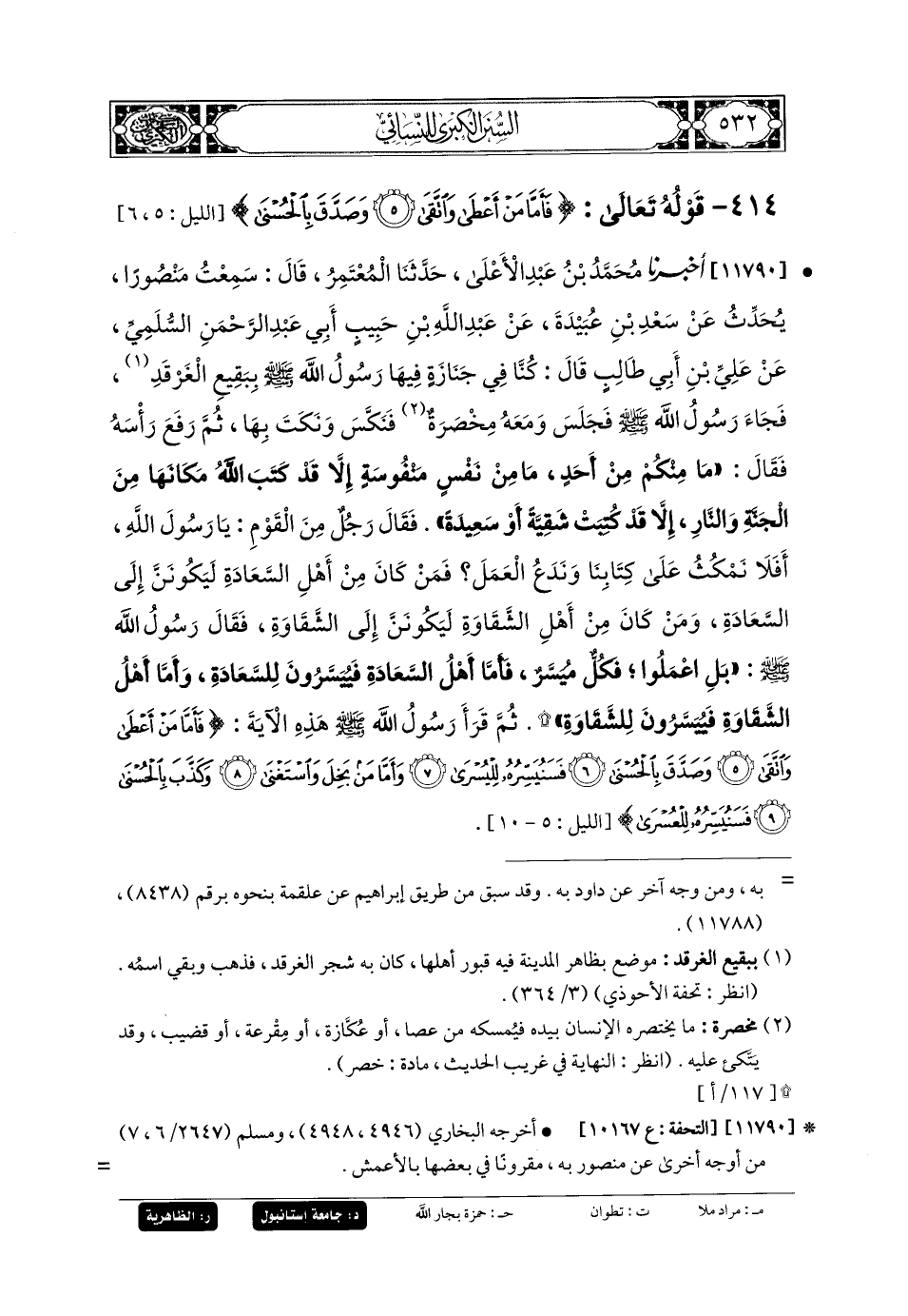 11790 - أَخبَرنا مُحَمدُ بنُ عَبدِ الأَعْلَى، حَدثنا المُعْتَمِرُ، قَالَ: سَمِعْتُ مَنصُورًا يُحَدِّثُ عَن سَعْدِ بنِ عُبَيدَةَ، عَن عَبدِ اللهِ بنِ حَبِيبٍ أَبي عَبدِ الرَّحمَنِ السَّلَمِيِّ، عَن عَليِّ بنِ أَبي طَالِبٍ، قَالَ: كُنَّا فِي جَنَازَةٍ فِيهَا رَسُولُ اللهِ صَلى الله عَليه وسَلم بِبَقِيعِ الغَرْقَدِ، فَجَاءَ رَسُولُ اللهِ صَلى الله عَليه وسَلم، فَجَلَسَ وَمَعَهُ مِخْصَرَةٌ، فَنَكَّسَ وَنَكَتَ بِهَا، ثُمَّ رَفَعَ رَأْسَهُ، فَقَالَ: مَا مِنْكُمْ مِنْ أَحَدٍ، مَا مِنْ نَفْسٍ مَنْفُوسَةٍ إِلاَّ قَدْ كَتَبَ اللهُ مَكَانَهَا مِنَ الجَنَّةِ وَالنَّارِ، إِلاَّ قَدْ كُتِبَتْ شَقِيَّةً أَوْ سَعِيدَةً، فَقَالَ رَجُلٌ مِنَ القَوْمِ: يَا رَسُولَ اللهِ، أَفَلا نَمْكُثُ عَلَى كِتَابِنَا وَنَدَعُ العَمَلَ، فَمَنْ كَانَ مِنْ أَهْلِ السَّعَادَةِ لَيَكُونَنَّ إِلَى السَّعَادَةِ، وَمَنْ كَانَ مِنْ أَهْلِ الشَّقَاوَةِ لَيَكُونَنَّ إِلَى الشَّقَاوَةِ؟ فَقَالَ رَسُولُ اللهِ صَلى الله عَليه وسَلم: بَلِ اعْمَلُوا، فَكُلٌّ مُيَسَّرٌ، فَأَمَّا أَهْلُ السَّعَادَةِ، فَيُيَسَّرُونَ لِلسَّعَادَةِ، وَأَمَّا أَهْلُ الشَّقَاوَةِ، فَيُيَسَّرُونَ لِلشَّقَاوَةِ، ثُمَّ قَرَأَ رَسُولُ اللهِ صَلَّى، اللهُ عَلَيْهِ وَسَلَّمَ هَذِهِ الآيَةَ: {فَأَمَّا مَنْ أَعْطَى وَاتَّقَى وَصَدَّقَ بِالحُسْنَى فَسَنُيَسِّرُهُ لِلْيُسْرَى وَأَمَّا مَنْ بَخِلَ وَاسْتَغْنَى وَكَذَّبَ بِالحُسْنَى فَسَنُيَسِّرُهُ لِلْعُسْرَى}.