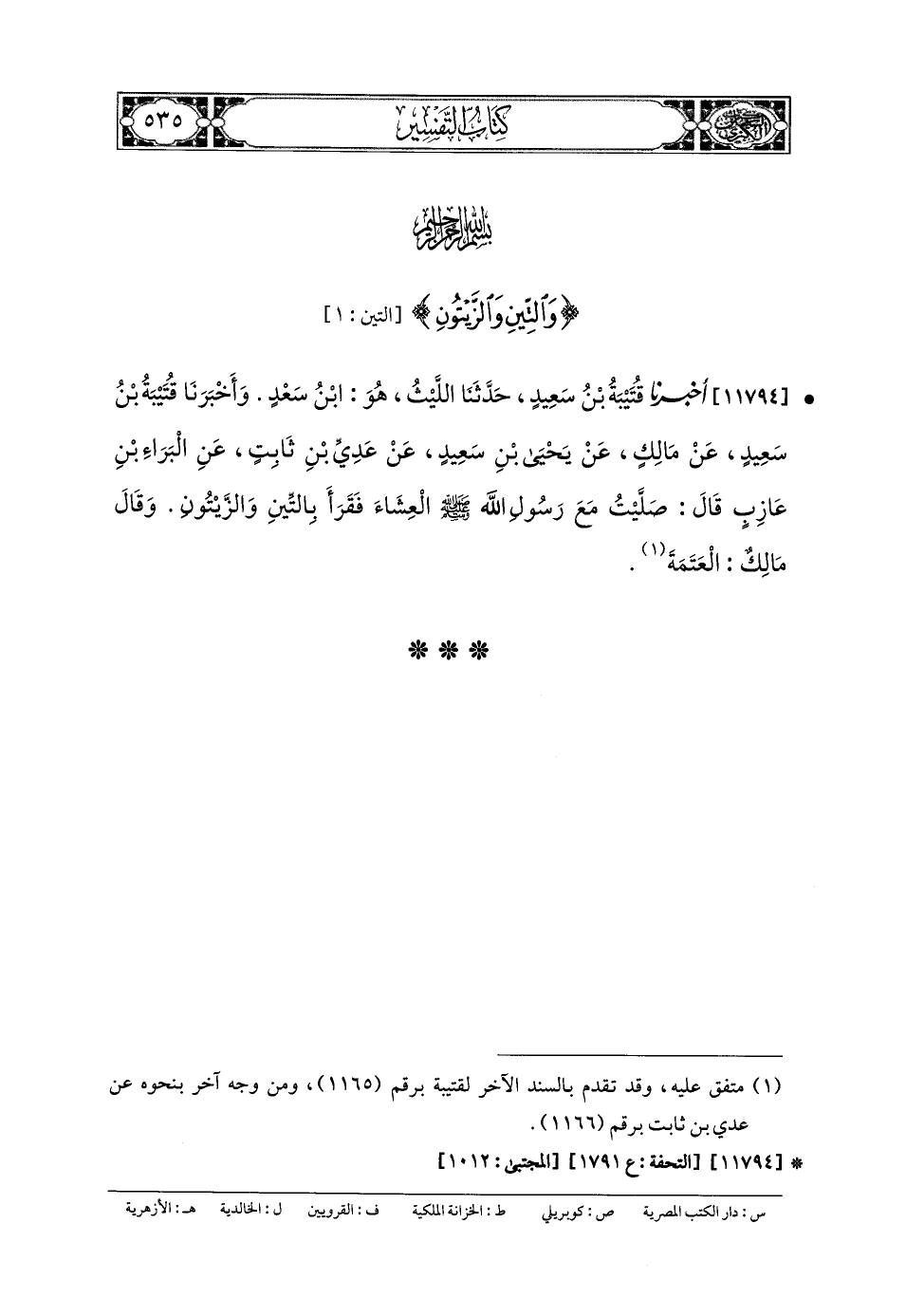 11794- أَخبَرنا قُتَيبَةُ بنُ سَعِيدٍ، حَدثنا اللَّيْثُ، هُوَ ابنُ سَعْدٍ (ح) وَأَخبَرنا قُتَيبَةُ بنُ سَعِيدٍ، عَن مَالِكٍ، عَن يَحيَى بنِ سَعِيدٍ، عَن عَدِيِّ بنِ ثَابِتٍ، عَنِ البَرَاءِ بنِ عَازِبٍ، قَالَ: صَلَّيْتُ مَعَ رَسُولِ اللهِ صَلى الله عَليه وسَلم العِشَاءَ، فَقَرَأَ بِالتِّينِ وَالزَّيْتُونِ، وَقَالَ مَالِكٌ: العَتَمَةَ.
