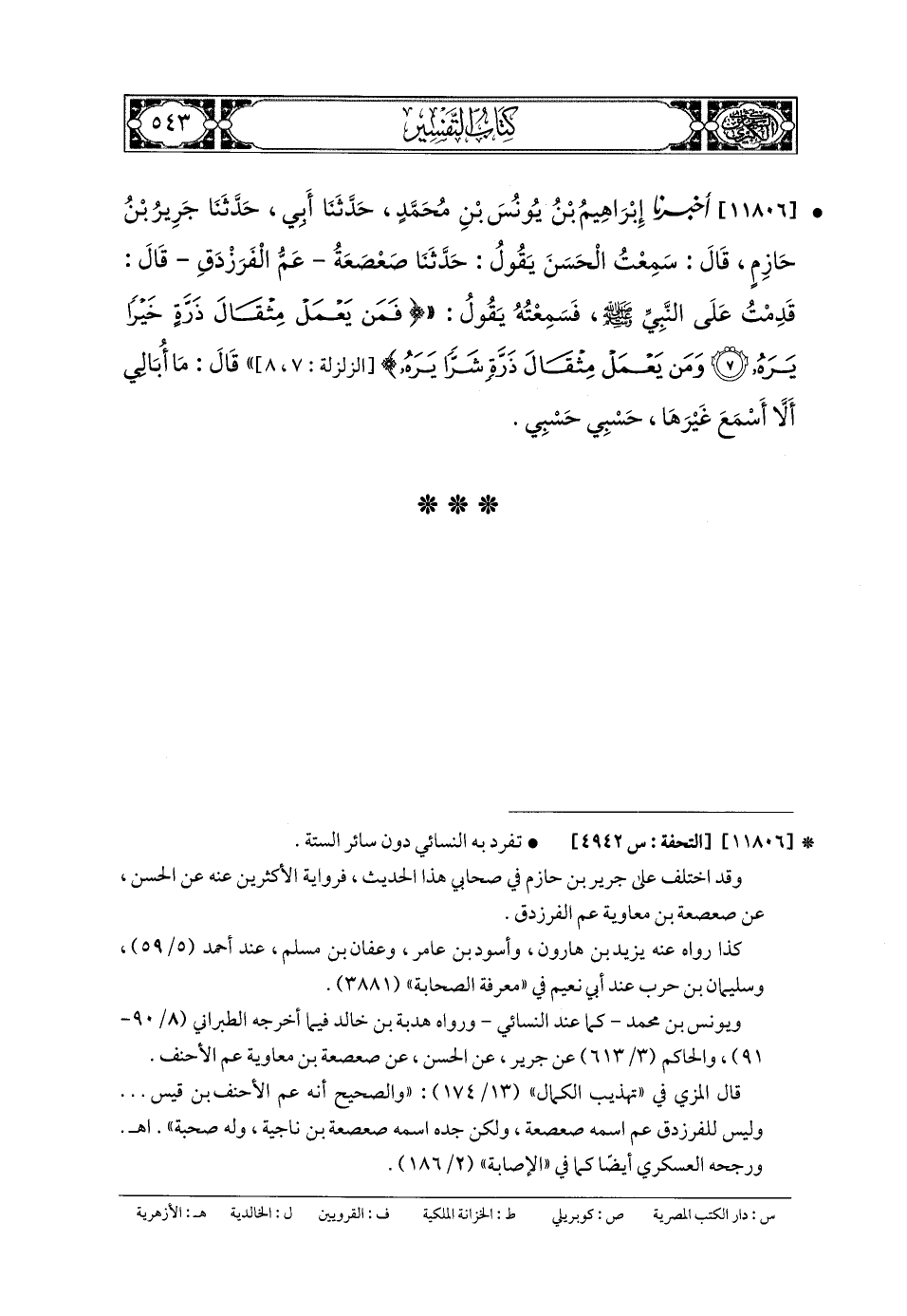 11806- أَخبَرنا إِبرَاهِيمُ بنُ يُونُسَ بنِ مُحَمدٍ، حَدثنا أَبي، حَدثنا جَرِيرُ بنُ حَازِمٍ، قَالَ: سَمِعْتُ الحَسَنَ يَقُولُ: حَدثنا صَعْصَعَةُ عَمُّ الفَرَزْدَقِ، قَالَ: قَدِمْتُ عَلَى النَّبيِّ صَلى الله عَليه وسَلم فَسَمِعْتُهُ يَقُولُ: {فَمَنْ يَعْمَلْ مِثْقَالَ ذَرَّةٍ خَيْرًا يَرَهُ وَمَنْ يَعْمَلْ مِثْقَالَ ذَرَّةٍ شَرًّا يَرَهُ}، قَالَ: مَا أُبَالِي أَلاَّ أَسْمَعَ غَيْرَهَا، حَسْبِي حَسْبِي.