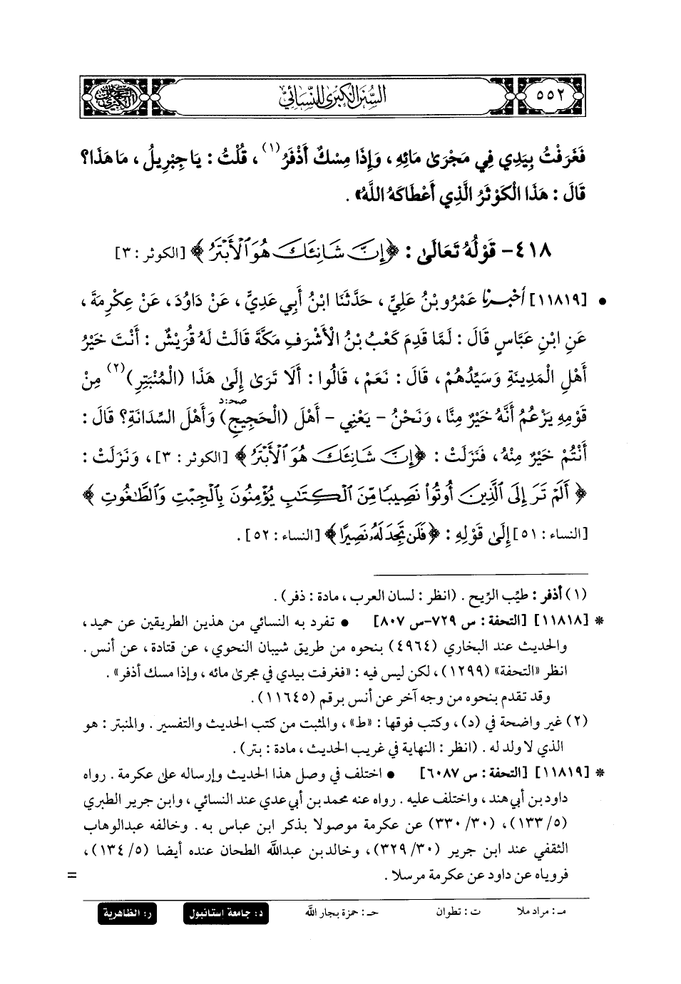 11819 - أَخبَرنا عَمرُو بنُ عَليٍّ، حَدثنا ابنُ أَبي عَدِيٍّ، عَن دَاوُدَ، عَن عِكْرِمَةَ، عَنِ ابنِ عَبَّاسٍ قَالَ: لَمَّا قَدِمَ كَعْبُ بنُ الأَشْرَفِ مَكَّةَ، قَالَتْ لَهُ قُرَيْشٌ: أَنْتَ خَيْرُ أَهْلِ المَدِينَةِ وَسَيِّدُهُمْ، قَالَ: نَعَمْ، قَالُوا: أَلا تَرَى إِلَى هَذَا المُنْبَتِرُ مِنْ قَوْمِهِ، يَزْعُمُ أَنَّهُ خَيْرٌ مِنَّا، وَنَحْنُ، يَعْنِي: أَهْلُ الحَجِيجِ، وَأَهْلُ السِّدَانَةِ، قَالَ: أَنْتُمْ خَيْرٌ مِنْهُ، فَنَزَلَتْ: {إِنْ شَانِئَكَ هُوَ الأَبْتَرُ}، وَنَزَلَتْ: {أَلَمْ تَرَ إِلَى الَّذِينَ أُوتُوا نَصِيبًا مِنَ الكِتَابِ يُؤْمِنُونَ بِالجِبْتِ وَالطَّاغُوتِ} إِلَى قَوْلِهِ: {فَلَنْ تَجِدَ لَهُ نَصِيرًا}.