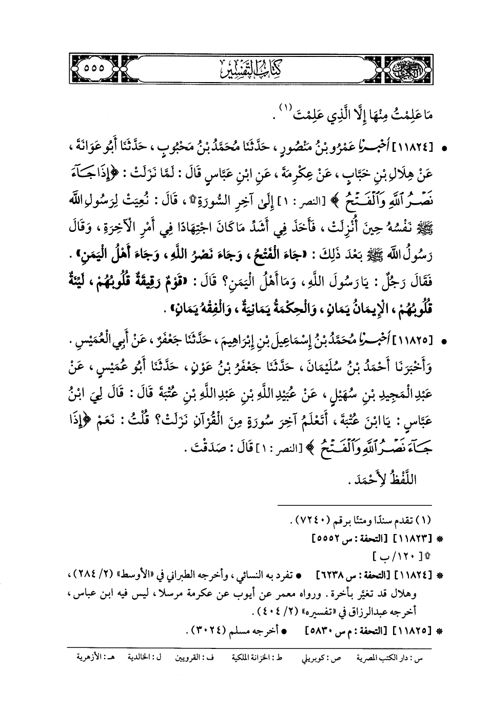 11825- أَخبَرنا مُحَمدُ بنُ إِسمَاعِيلَ بنِ إِبرَاهِيمَ، حَدثنا جَعفَرٌ، عَن أَبي العُمَيْسِ (ح) وَأَخبَرنا أَحْمَدُ بنُ سُلَيمَانَ، حَدثنا جَعفَرُ بنُ عَوْنٍ، حَدثنا أَبو عُمَيْسٍ، عَن عَبدِ المَجِيدِ بنِ سُهَيلٍ، عَن عُبَيدِ اللهِ بنِ عَبدِ اللهِ بنِ عُتْبَةَ، قَالَ: قَالَ لِي ابنُ عَبَّاسٍ: يَا ابنَ عُتْبَةَ، أَتَعْلَمُ آخِرَ سُورَةٍ مِنَ القُرْآنِ نَزَلَتْ؟ قُلْتُ: نَعَمْ، {إِذَا جَاءَ نَصْرُ اللهِ وَالفَتْحُ}، قَالَ: صَدَقْتَ.