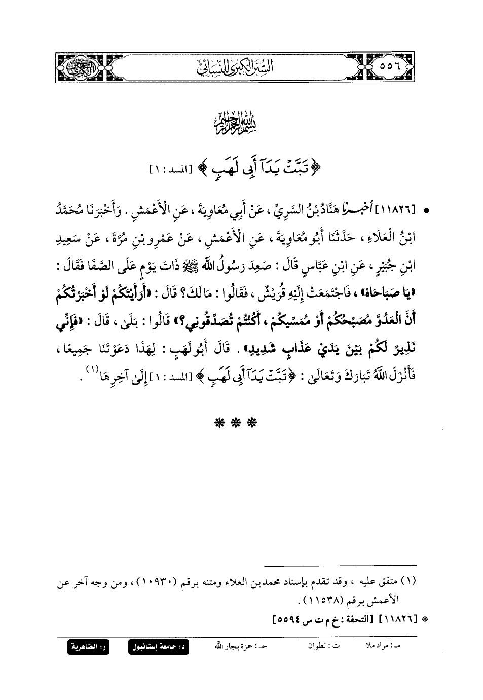 11826- أَخبَرنا هَنَّادُ بنُ السَّرِيِّ، عَن أَبي مُعاويَةَ، عَنِ الأَعْمَشِ (ح) وَأَخبَرنا مُحَمدُ بنُ العَلاءِ، حَدثنا أَبو مُعاويَةَ، عَنِ الأَعْمَشِ، عَن عَمْرِو بنِ مُرَّةَ، عَن سَعِيدِ بنِ جُبَيرٍ، عَنِ ابنِ عَبَّاسٍ، قَالَ: صَعِدَ رَسُولُ اللهِ صَلى الله عَليه وسَلم ذَاتَ يَوْمٍ عَلَى الصَّفَا، فَقَالَ: يَا صَبَاحَاهُ، فَاجْتَمَعَتْ إِلَيْهِ قُرَيْشٌ، فَقَالُوا: مَا لَكَ؟ قَالَ: أَرَأَيْتَكُمْ لَوْ أَخبَرْتُكُمْ أَنَّ العَدُوَّ مُصَبِّحُكُمْ أَوْ مُمَسِّيكُمْ، أَكُنْتُمْ تُصَدِّقُونِي؟ قَالُوا: بلى، قَالَ: فَإِنِّي نَذِيرٌ لَكُمْ بَيْنَ يَدَيْ عَذَابٍ شَدِيدٍ، قَالَ أَبو لَهَبٍ: لِهَذَا دَعَوْتَنَا جَمِيعًا، فَأَنْزَلَ اللهُ تَبَارَكَ وَتَعَالَى: {تَبَّتْ يَدَا أَبي لَهَبٍ وَتَبَّ ... } إِلَى آخِرِهَا.