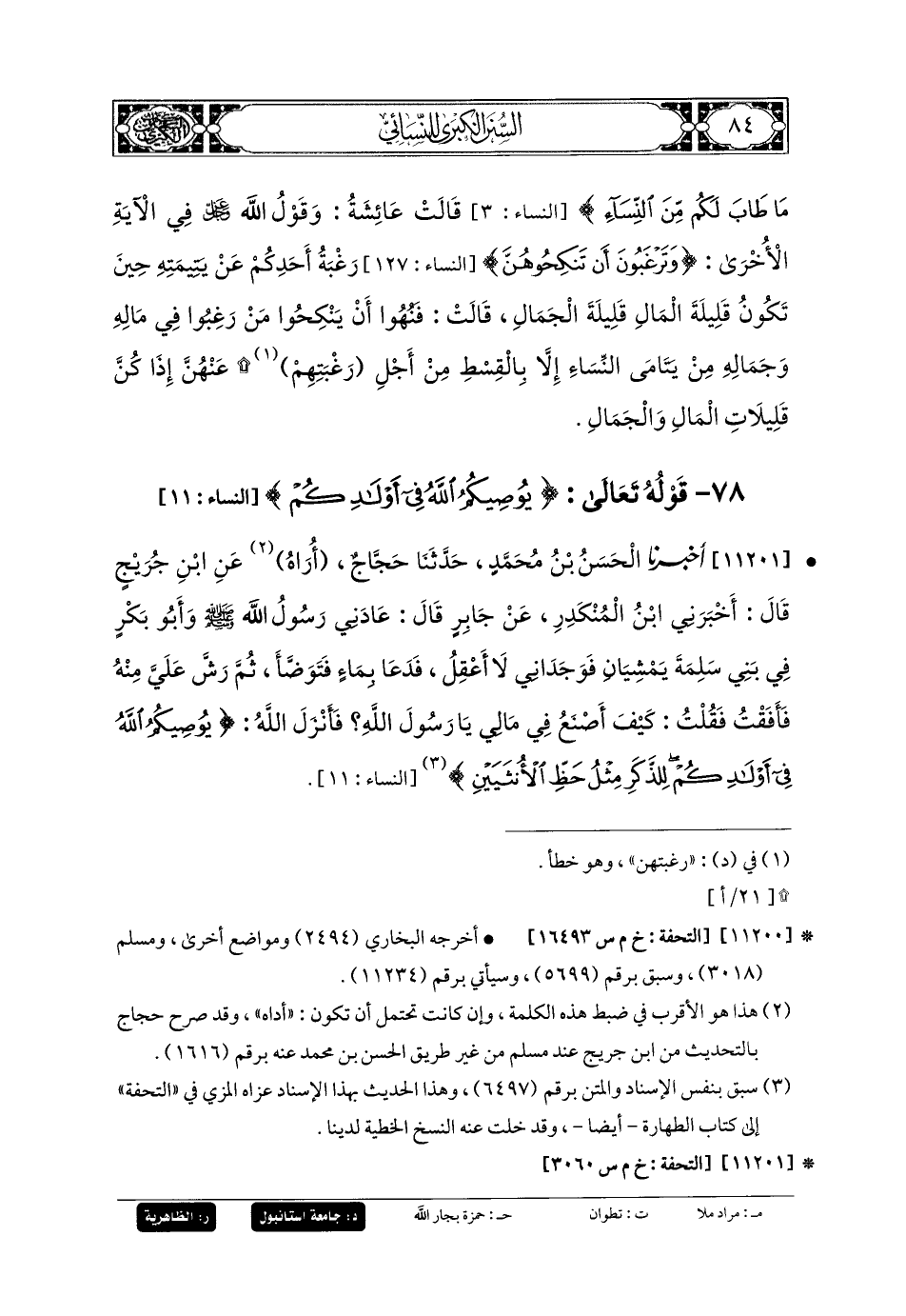 11201- أَخبَرنا الحَسَنُ بنُ مُحَمدٍ، حَدثنا حَجَّاجٌ، أراهُ عَنِ ابنِ جُرَيْجٍ، قَالَ: أَخبَرني ابنُ المُنْكَدِرِ، عَن جَابِرٍ، قَالَ: عَادَنِي رَسُولُ اللهِ صَلى الله عَليه وسَلم وَأَبو بَكْرٍ فِي بَنِي سَلَمَةَ يَمْشِيَانِ، فَوَجَدَانِي لا أَعْقِلُ، فَدَعَا بِمَاءٍ فَتَوَضَّأَ، ثُمَّ رَشَّ عَلَيَّ مِنْهُ، فَأَفَقْتُ، فَقُلْتُ: كَيْفَ أَصْنَعُ فِي مَالِي يَا رَسُولَ اللهِ؟ فَأَنْزَلَ اللهُ: {يُوصِيكُمُ اللهُ فِي أَوْلادِكُمْ لِلذَّكَرِ مِثْلُ حَظِّ الأُنْثَيَيْنِ}.