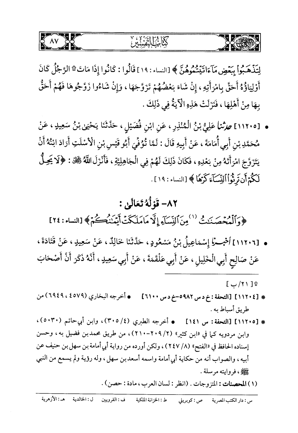 11206- أَخبَرنا إِسمَاعِيلُ بنُ مَسْعُودٍ، حَدثنا خَالِدٌ، عَن سَعِيدٍ، عَن قَتَادَةَ، عَن صَالِحِ أَبي الخَلِيلِ، عَن أَبي عَلْقَمَةَ، عَن أَبي سَعِيدٍ، أَنَّهُ ذَكَرَ أَنَّ أَصْحَابَ رَسُولِ اللهِ صَلى الله عَليه وسَلم أَصَابُوا سَبَايَا مِنْ أَهْلِ الشِّرْكِ، فَكَانَ نَاسٌ مِنْ أَصْحَابِ رَسُولِ اللهِ صَلى الله عَليه وسَلم كَفُّوا عَن غِشْيَانِهِنَّ مِنِ أَجْلِ أَزْوَاجِهِنَّ، فَنَزَلَتْ: {وَالمُحْصَنَاتُ مِنَ النِّسَاءِ إِلاَّ مَا مَلَكَتْ أَيْمَانُكُمْ}.