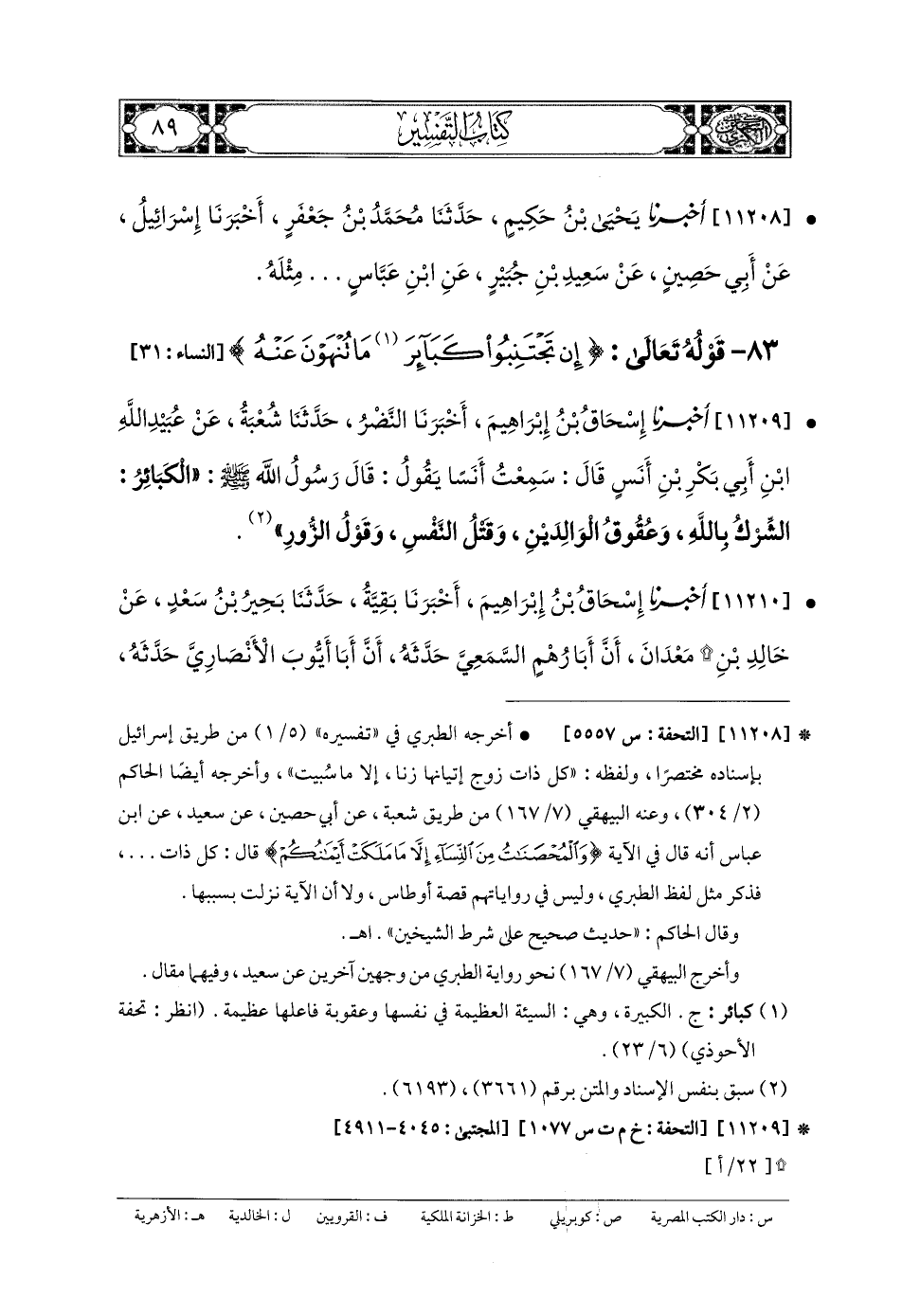 11209- أَخبَرنا إِسحَاقُ بنُ إِبرَاهِيمَ، أَخبَرنا النَّضْرُ، حَدثنا شُعبَةُ، عَن عُبَيدِ اللهِ بنِ أَبي بَكْرِ بنِ أَنَسٍ، قَالَ: سَمِعْتُ أَنَسًا يَقُولُ: قَالَ رَسُولُ اللهِ صَلى الله عَليه وسَلم: الكَبَائِرُ: الشِّرْكُ بِاللهِ، وَعُقُوقُ الوَالِدَيْنِ، وَقَتْلُ النَّفْسِ، وَقَوْلُ الزُّورِ.