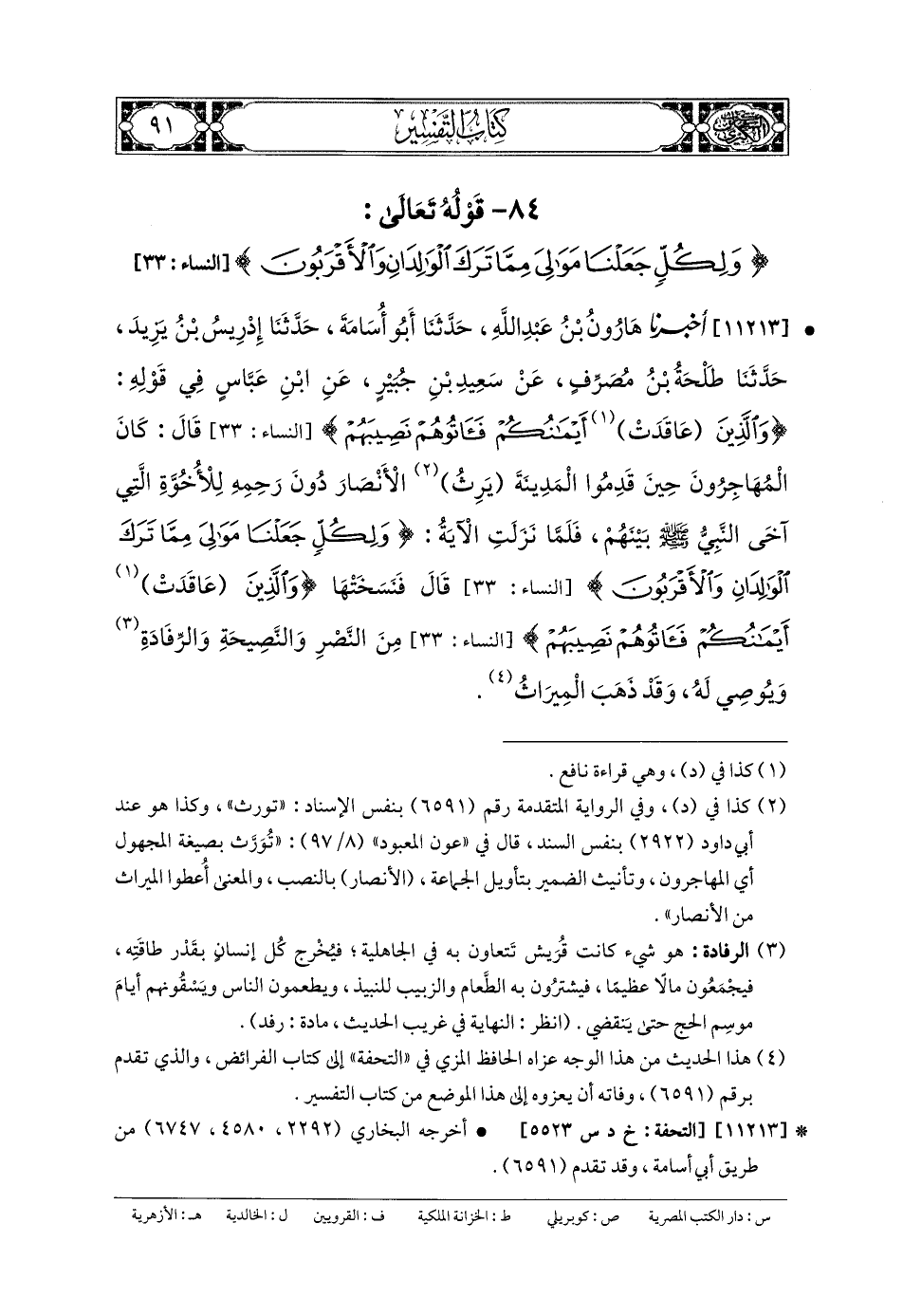 11213- أَخبَرنا هَارُونُ بنُ عَبدِ اللهِ، حَدثنا أَبو أُسَامَةَ، حَدثنا إِدرِيسُ بنُ يَزِيدَ، حَدثنا طَلحَةُ بنُ مُصَرِّفٍ، عَن سَعِيدِ بنِ جُبَيرٍ، عَنِ ابنِ عَبَّاسٍ، فِي قَوْلِهِ: {وَالَّذِينَ عَاقَدَتْ أَيْمَانُكُمْ فَآتُوهُمْ نَصِيبَهُمْ} قَالَ: كَانَ المُهَاجِرُونَ حِينَ قَدِمُوا المَدِينَةَ يَرِثُ الأَنْصَارَ دُونَ رَحِمِهِ؛ لِلأُخُوَّةِ الَّتِي آخَى النَّبيُّ صَلى الله عَليه وسَلم بَيْنَهُمْ، فَلَمَّا نَزَلَتِ الآيَةُ: {وَلِكُلٍّ جَعَلْنَا مَوَالِيَ مِمَّا تَرَكَ الوَالِدَانِ وَالأَقْرَبُونَ} قَالَ: فَنَسَخَتْهَا: {وَالَّذِينَ عَاقَدَتْ أَيْمَانُكُمْ فَآتُوهُمْ نَصِيبَهُمْ} مِنَ النَّصْرِ، وَالنَّصِيحة، وَالرِّفَادَةِ، وَيُوصِي لَهُ، وَقَدْ ذَهَبَ المِيرَاثُ.