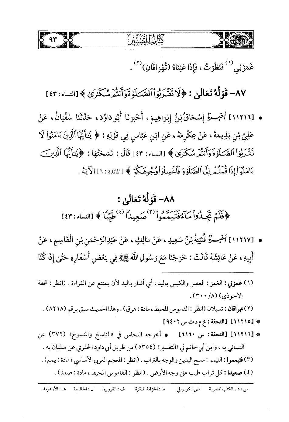 11217- أَخبَرنا قُتَيبَةُ بنُ سَعِيدٍ، عَن مَالِكٍ، عَن عَبدِ الرَّحمَنِ بنِ القَاسِمِ، عَن أَبيهِ، عَن عَائِشَةَ، قَالَتْ: خَرَجْنَا مَعَ رَسُولِ اللهِ صَلى الله عَليه وسَلم فِي بَعْضِ أَسْفَارِهِ حَتَّى إِذَا كُنَّا بِالبَيْدَاءِ، أَوْ بِذَاتِ الجَيْشِ، انْقَطَعَ عِقْدٌ لِي، فَأَقَامَ رَسُولُ اللهِ صَلى الله عَليه وسَلم عَلَى التِمَاسِهِ، وَأَقَامَ النَّاسُ مَعَهُ وَلَيْسُوا عَلَى مَاءٍ، وَلَيْسَ مَعَهُمْ مَاءٌ، فَأَتَى النَّاسُ أَبَا بَكْرٍ رَضِيَ اللهُ عَنهُ، فَقَالُوا: أَلا تَرَى مَا صَنَعَتْ عَائِشَةُ، أَقَامَتْ بِرَسُولِ اللهِ صَلى الله عَليه وسَلم وَبِالنَّاسِ وَلَيْسُوا عَلَى مَاءٍ، وَلَيْسَ مَعَهُمْ مَاءٌ؟ فَجَاءَ أَبو بَكْرٍ، وَرَسُولُ اللهِ صَلى الله عَليه وسَلم عَلَى فَخِذِي قَدْ نَامَ، فَقَالَ: أَحَبَسْتِ رَسُولَ اللهِ صَلى الله عَليه وسَلم وَالنَّاسَ، وَلَيْسُوا عَلَى مَاءٍ، وَلَيْسَ مَعَهُمْ مَاءٌ؟ قَالَتْ: فَعَاتَبَنِي أَبو بَكْرٍ، وَقَالَ مَا شَاءَ اللهُ أَنْ يَقُولَ، وَجَعَلَ يَطْعَنُ بِيَدِهِ فِي خَاصِرَتِي، فَمَا يَمْنَعُنِي مِنَ التَّحَرُّكِ إِلاَّ مَكَانُ رَأْسِ رَسُولِ اللهِ صَلى الله عَليه وسَلم عَلَى فَخِذِي، حَتَّى أَصْبَحَ عَلَى غَيْرِ مَاءٍ، فَأَنْزَلَ اللهُ عَزَّ وَجَلَّ آيَةَ التَّيَمُّمِ: {فَتَيَمَّمُوا}، فقَالَ أُسَيْدُ بنُ حُضَيْرٍ: مَا هِيَ بِأَوَّلِ بَرَكَتِكُمْ يَا آلَ أَبي بَكْرٍ، قَالَ: فَبَعَثْنَا البَعِيرَ الَّذِي كُنْتِ عَلَيْهِ فَوَجَدْنَا العِقْدَ تَحْتَهُ.