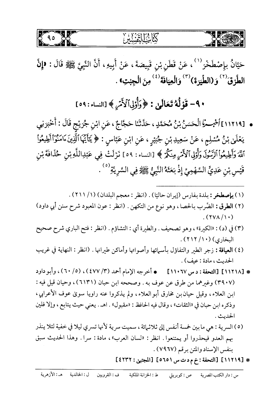 11219- أَخبَرنا الحَسَنُ بنُ مُحَمدٍ، حَدثنا حَجَّاجٌ، عَنِ ابنِ جُرَيْجٍ، قَالَ: أَخبَرني يَعْلَى بنُ مُسْلِمٍ، عَن سَعِيدِ بنِ جُبَيرٍ، عَنِ ابنِ عَبَّاسٍ: {يَا أَيُّهَا الَّذِينَ آمَنُوا أَطِيعُوا اللهَ وَأَطِيعُوا الرَّسُولَ وَأُولِي الأَمْرِ مِنْكُمْ} نَزَلَتْ فِي عَبدِ اللهِ بنِ حُذَافَةَ بنِ قَيْسِ بنِ عَدِيٍّ السَّهْمِيِّ، إِذْ بَعَثَهُ النَّبيُّ صَلى الله عَليه وسَلم فِي السَّرِيَّةِ.