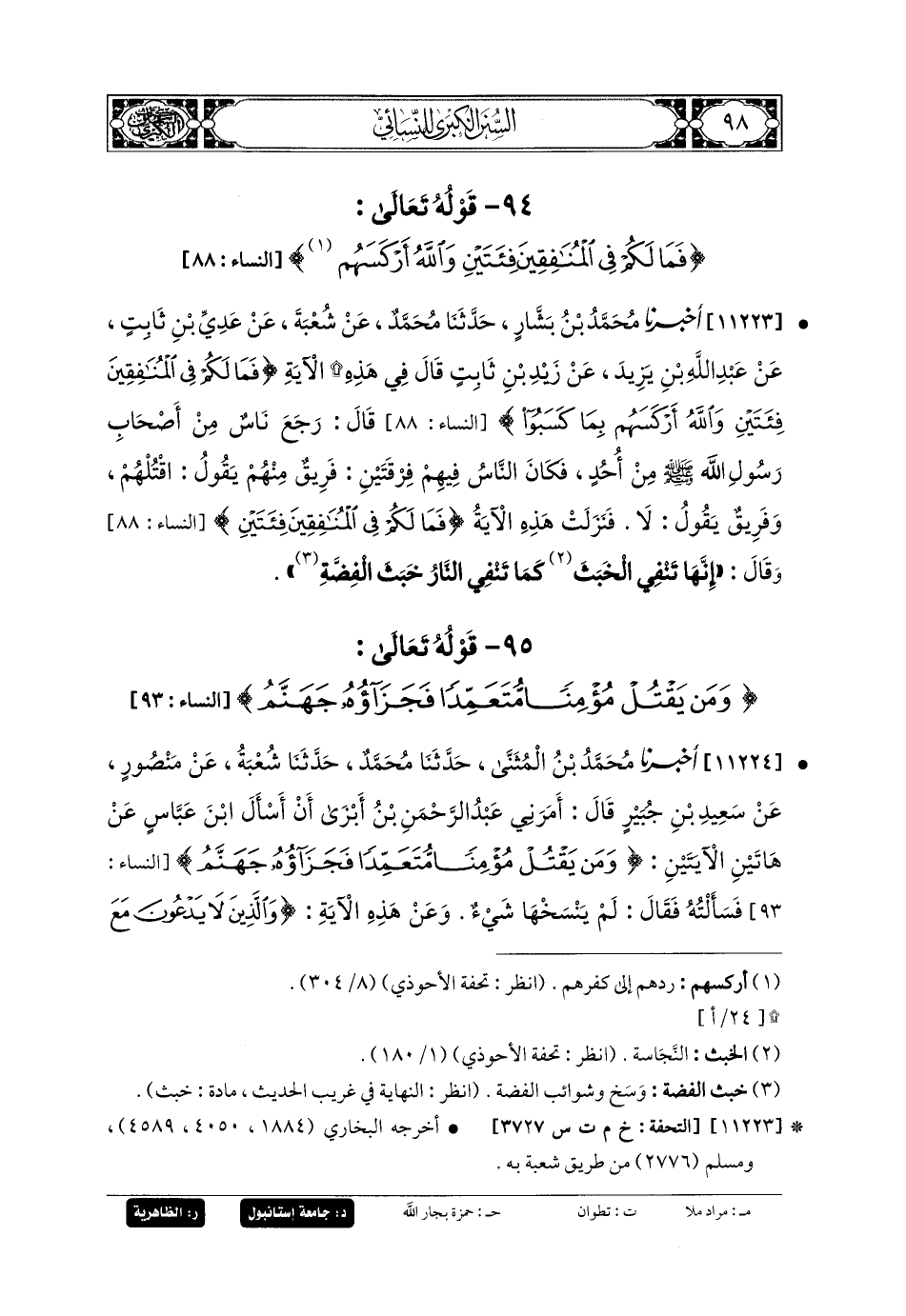 11223- أَخبَرنا مُحَمدُ بنُ بَشَّارٍ، حَدثنا مُحَمدٌ، عَن شُعبَةَ، عَن عَدِيِّ بنِ ثَابِتٍ، عَن عَبدِ اللهِ بنِ يَزِيدَ، عَن زَيْدِ بنِ ثَابِتٍ، قَالَ فِي هَذِهِ الآيَةِ: {فَمَا لَكُمْ فِي المُنَافِقِينَ فِئَتَيْنِ وَاللهُ أَرْكَسَهُمْ بِمَا كَسَبُوا} قَالَ: رَجَعَ نَاسٌ مِنْ أَصْحَابِ رَسُولِ اللهِ صَلى الله عَليه وسَلم مِنْ أُحُدٍ، فَكَانَ النَّاسُ فِيهِمْ فِرْقَتَيْنِ: فَرِيقٌ مِنْهُمْ يَقُولُ: اقْتُلْهُمْ، وَفَرِيقٌ يَقُولُ: لا، فَنَزَلَتِ الآيَةُ: {فَمَا لَكُمْ فِي المُنَافِقِينَ فِئَتَيْنِ} وَقَالَ: إِنَّهَا تَنْفِي الخَبَثَ، كَمَا تَنْفِي النَّارُ خَبَثَ الفِضَّةِ.