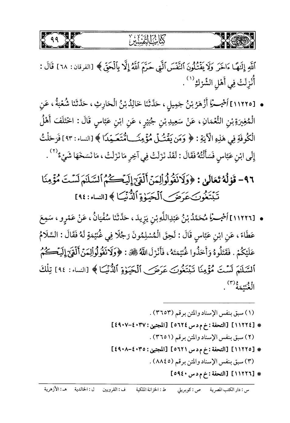 11226- أَخبَرنا مُحَمدُ بنُ عَبدِ اللهِ بنِ يَزِيدَ، حَدثنا سُفيانُ، عَن عَمْرٍو، سَمِعَ عَطَاءً، عَنِ ابنِ عَبَّاسٍ، قَالَ: لَحِقَ المُسْلِمُونَ رَجُلاً فِي غُنَيْمَةٍ لَهُ، فَقَالَ: السَّلامُ عَلَيْكُمْ، فَقَتَلُوهُ، وَأَخَذُوا غُنَيْمَتَهُ، فَأَنْزَلَ اللهُ عَزَّ وَجَلَّ: {وَلا تَقُولُوا لِمَنْ أَلْقَى إِلَيْكُمُ السَّلامَ لَسْتَ مُؤْمِنًا تَبْتَغُونَ عَرَضَ الحَيَاةِ الدُّنْيَا} تِلْكَ الغُنَيْمَةُ.
