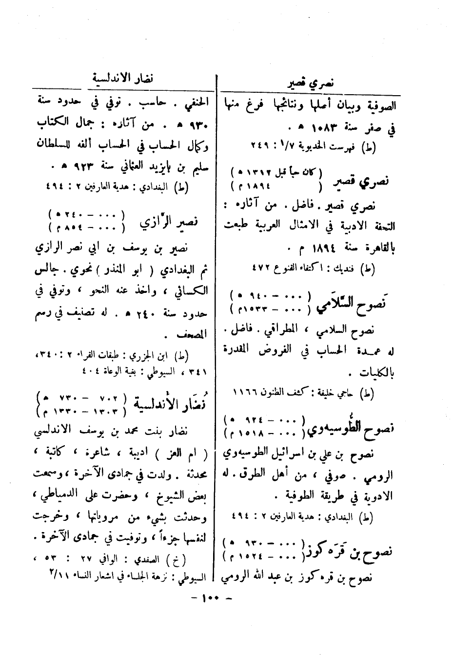 (ط) البغدادي: هدية العارفين 2: 494 نصير الرازي (000 - 240 هـ) (000 - 854 م) نصير بن يوسف بن ابي نصر الرازي ثم البغدادي (أبو المنذر) نحوي.