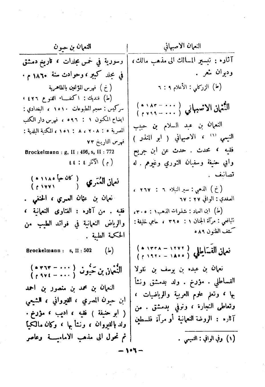 (ط) ابن العماد: شذرات الذهب 1: 305، اليافعي: مرآة الجنان 1: 395، حاجي خليفة: كشف الظنون 589 نعمان القساطلي (1272 - 1338 هـ) (1855 - 1920 م) نعمان بن عبده بن يوسف بن نقولا القساطلي.